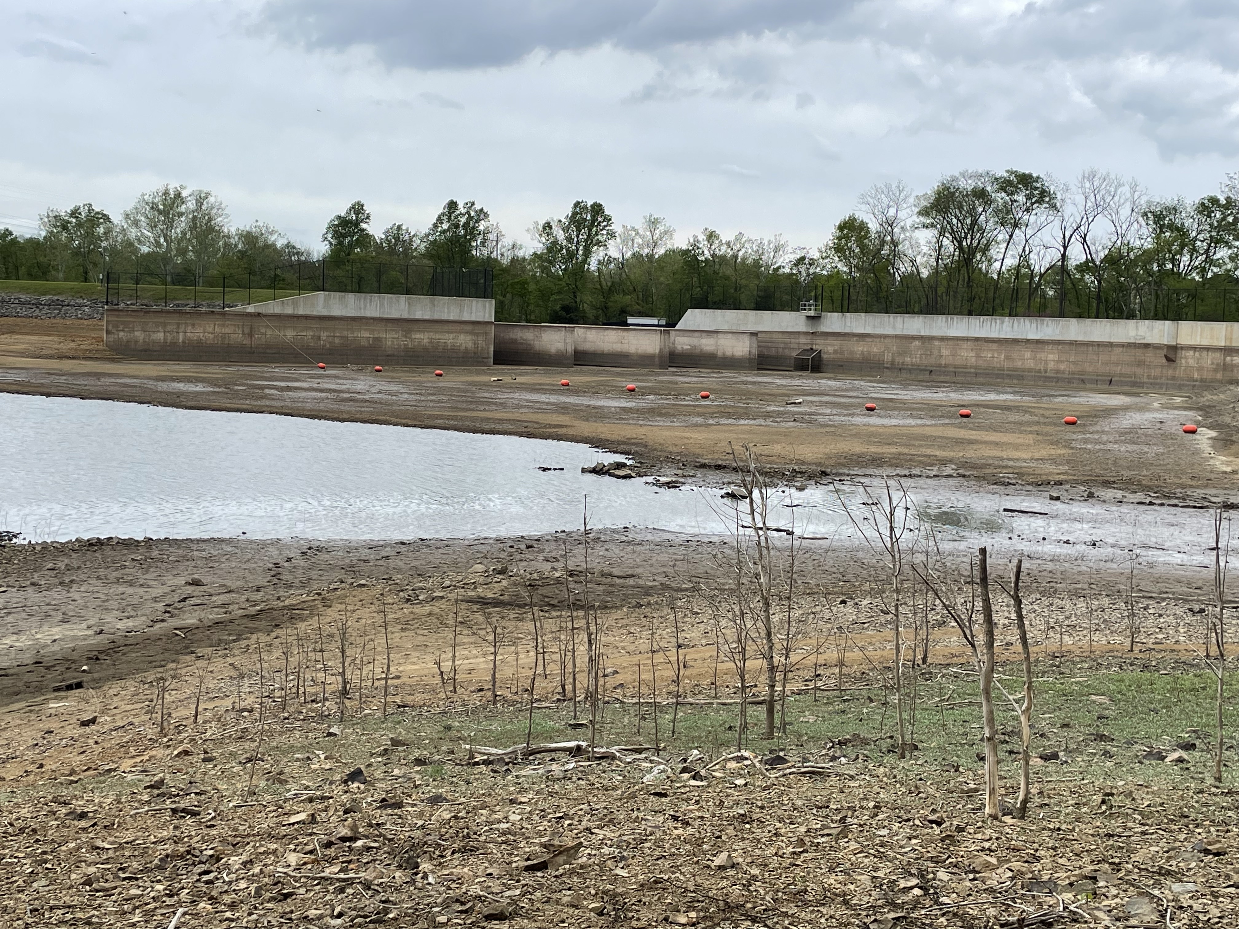 Plate 6. View looking north towards the outflow gate of Beaver Dam reservoir, showing the weirs and maximum water level (about fifteen feet above present level). The low water level suggests that evaporation and ground-seepage (not much with the subsurface comprising diabase) exceed local run-off. This is the reason for the post title. Rainfall has been low enough that the water level keeps dropping, even after the reservoir was emptied. Is it a drought?