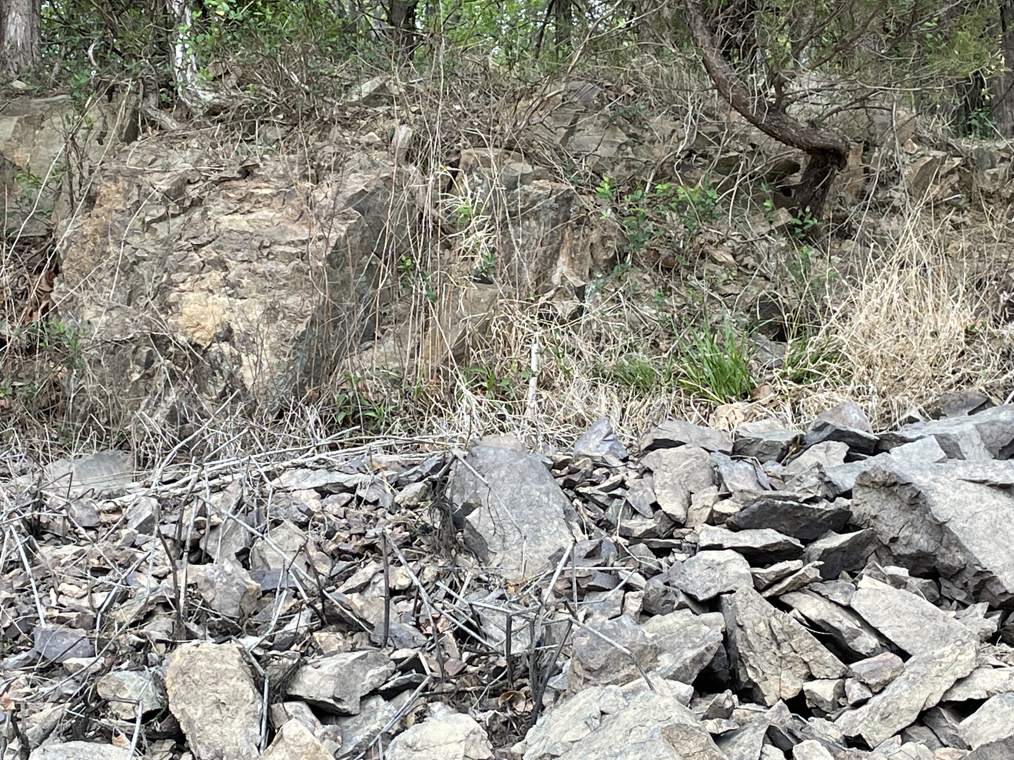 Plate 5. This photo shows a large outcrop at the high-water mark of the reservoir. Note the angular structure of the outcrop (lighter rock at the upper left of the image) and the pieces broken off during construction of the reservoir.