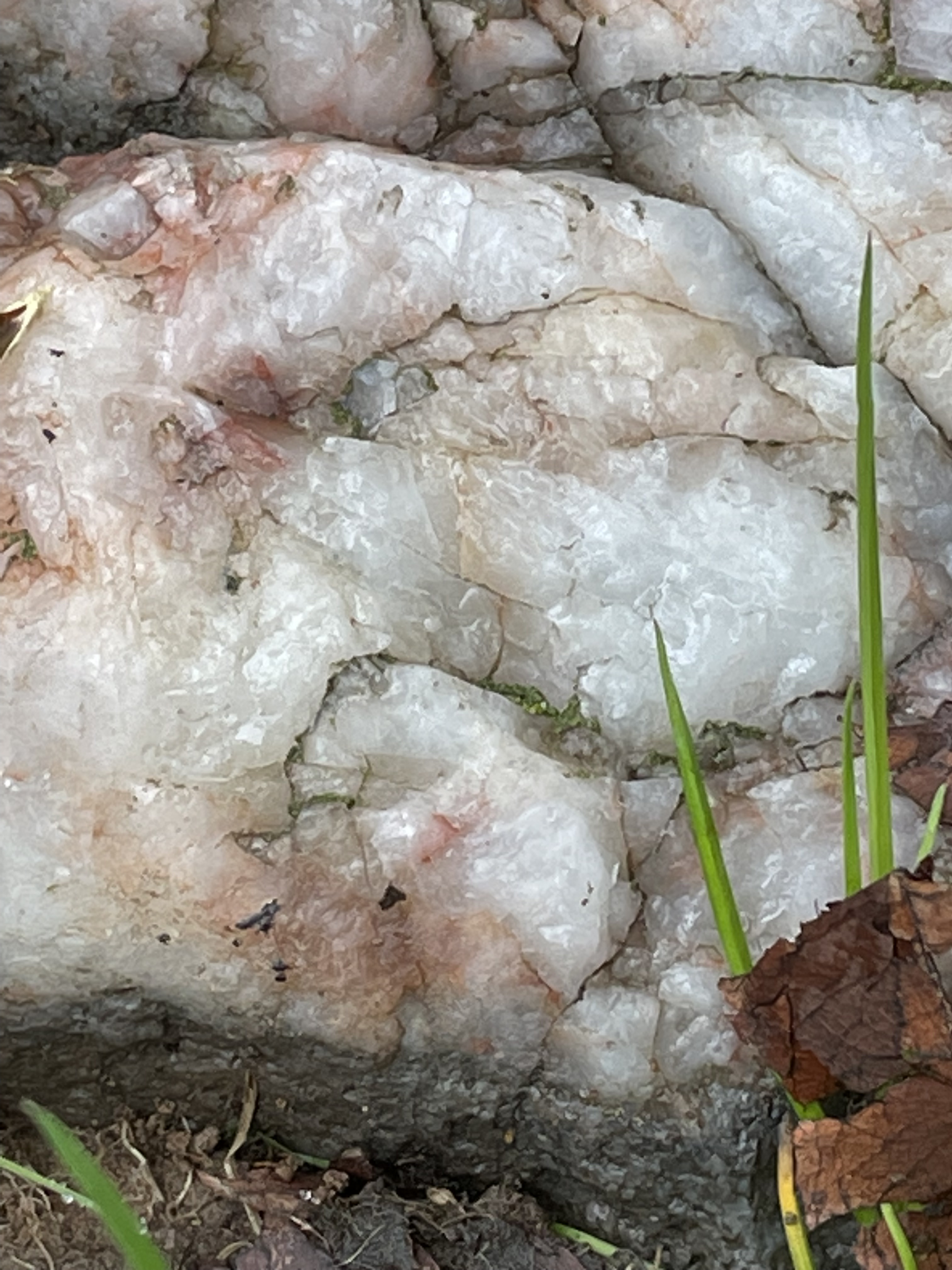 Plate 6. Close-up of a boulder (~1 foot across) of quartz lying on the ground within Area B. The sedimentary rocks do not contain quartz boulders, nor does the diabase that is present east of BRF. This sample must have been eroded from not far away, based on its size, as BRF raised the plateau to the west, and traveled down a long-gone stream, before lowering as the softer Bull Run Siltstone rocks eroded. It rode a geological elevator to its current elevation. Proterozoic granitoid rocks are common west of BRF and quartz is a common constituent of metasedimentary rocks, as we saw in a previous post.