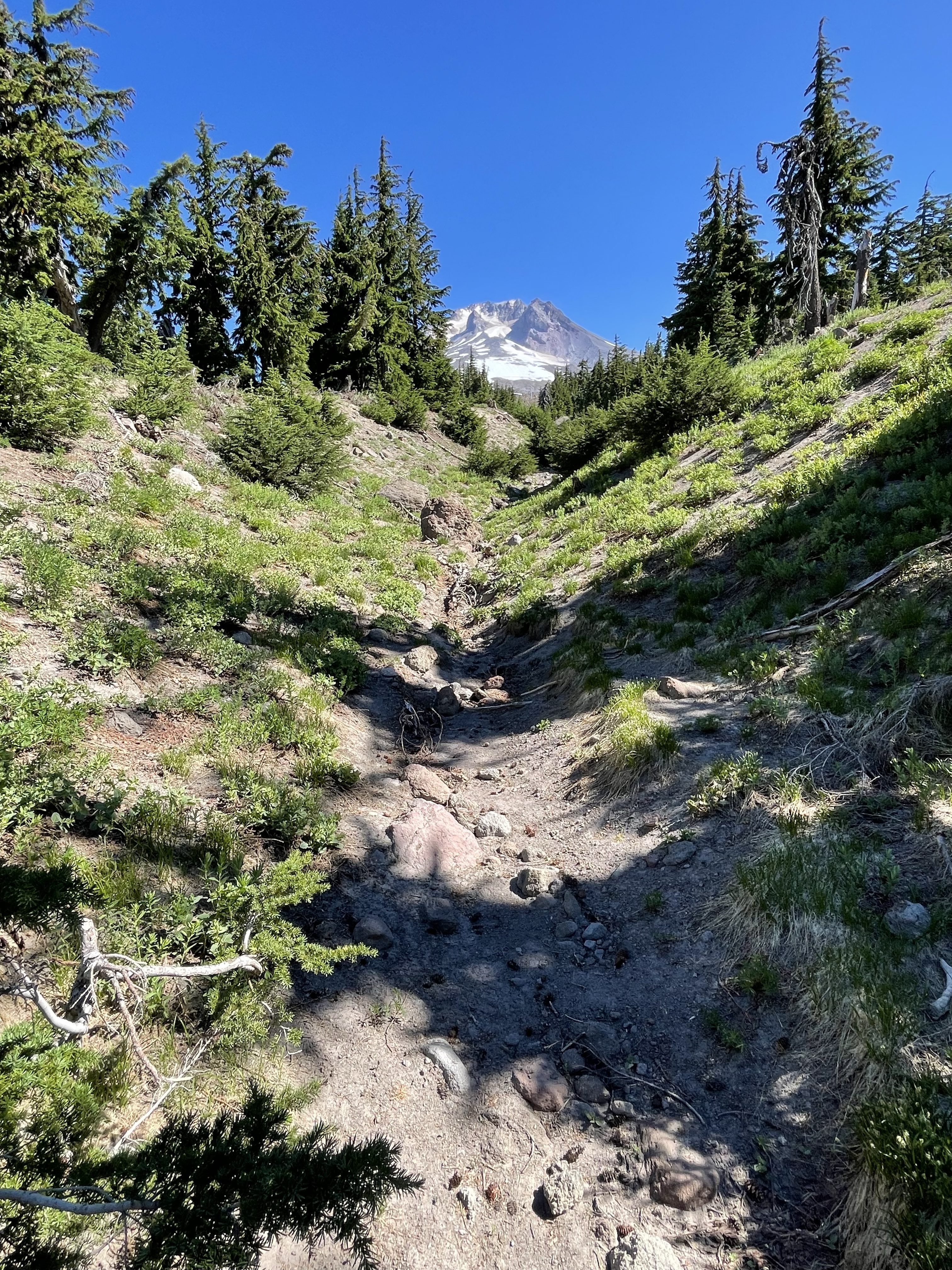 Figure 1. This is Mt. Hood seen from the south. The peak is about about 11,240 feet and this photo was taken from an elevation of 6000 feet, at the Timberline lodge. Several eruptions and collapses have occurred in the last few millennia, leaving the summit asymmetric. Note how the left side appears to be missing. Material has been transported/erupted down the slope towards the camera. The near-field shows two ridges constructed of debris transported as fluidized sediment, carrying huge boulders as well as sand and even ash down the slope in a series of tongues. These deposits are called lahars. Note the wide range of sizes of material near the camera, some larger blocks are still angular while others are rounded. The lahar sweeps up everything in its path but is limited in extent.Figure 2. Geologic map of Mt. Hood from RockD. The study area was along the slope near the closed path to the left of center in this map. Note the linear ridges originating at the summit. These are lahar deposits (pyroclastic and debris flows), colored in pale yellow-green. The darker shades are ash and lava with a composition of andesite and Dacite (extrusive igneous rocks low and high in silica, respectively). The underlying magma chamber was long lived (tens of millions of years) and evolved chemically. Figure 3. This image of a typical boulder is about one inch across. It has a very fine matrix with angular, light-colored crystals that are probably feldspar and quartz. The large one looks like quartz to me, which suggests that this particular sample is Dacite. This was blown out of the volcano and later eroded, rolling down the hill and becoming part of a debris flow. These phenocrysts were probably torn apart during an eruption and trapped in red-hot, fine ash as volcanic bombs near the summit.Figure 4. Photo of the linear channel between two debris flow ridges. Note the presence of vegetation on the slope, including trees. It takes a few centuries or longer to form soil for plants to grow in. The scene in Fig. 1 is very different, with sparse vegetation. Look up the channel and you see the summit; it was a straight run downhill for the lahar. Figure 5. This photo shows the termination of a lahar as well as any other; they run out of momentum and stop without flowing out like water, because of their high viscosity. This has been occurring for millions of years, so the entire region on which Mt. Hood rests consists of subterranean flows like these, one piled on top of another; lava, ash, mud … repeat. A careful examination of Fig. 2 will show that the ridges radiating from Mt. Hood often end in bulbous terminations. Erosion has softened their morphology somewhat.