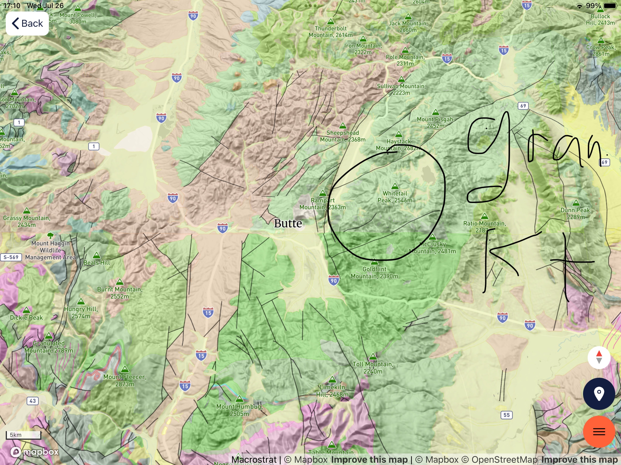 This post is experimental and not particularly interesting, but it is the best I can do under the circumstances; I followed Interstate 90 through the Rocky Mountains at 70 mph, with no pull-offs, and trying to take photos in the heavy traffic would have been suicidal. Instead of including a map, photos of outcrops, and some close-ups to examine mineralogy, I am relying on geological maps and my memory. The most experimental part is that I’m working on an iPad, which is a blessing and a curse. Let’s see how it worked out.