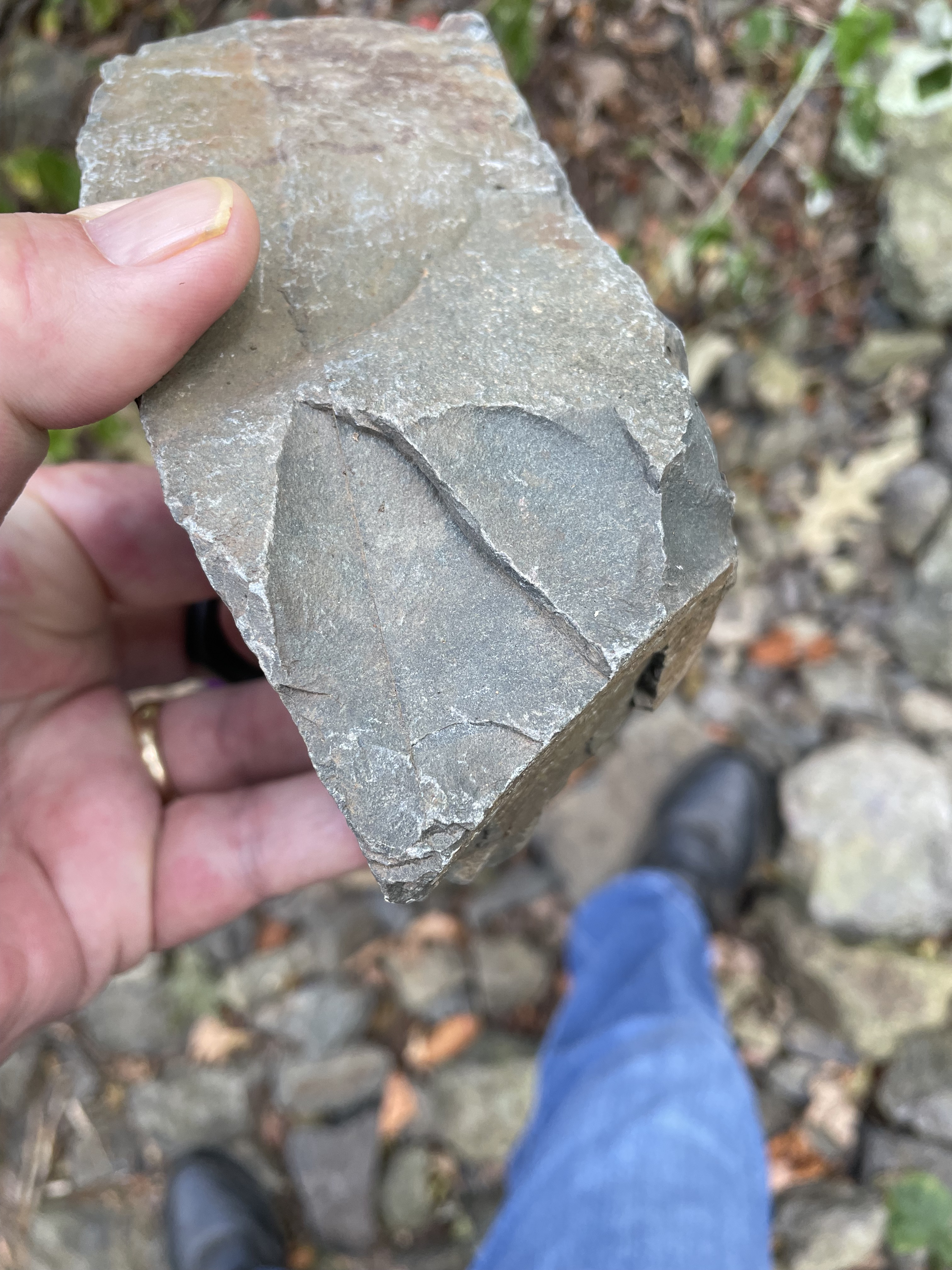 Figure 8. This hand sample was photographed at the top of Dickey Hill. It is as fresh a sample as you can get without a rock-hammer. Note the thin filament of material separating two conchoidal fracture zones. The greenish color is why metabasalts are called greenschist.