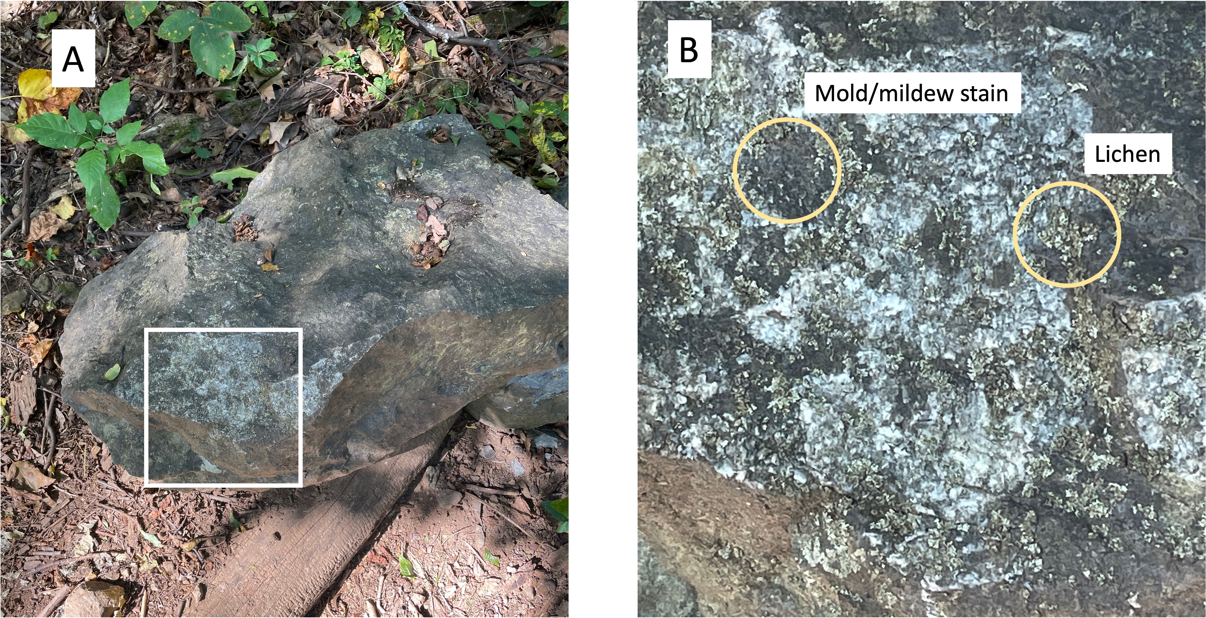 Figure 4. Example of what metabasalts look like in the field. (A) boulder showing a greenish hue that has been roughed up a bit and is no longer angular. (B) Close up of area enclosed in (A), showing some of the biological materials that produce the mottled appearance of these rocks. The bright areas with angular form are probably quartz and feldspar, two minerals commonly associated with greenschist facies metamorphism (low pressure and low temperature).