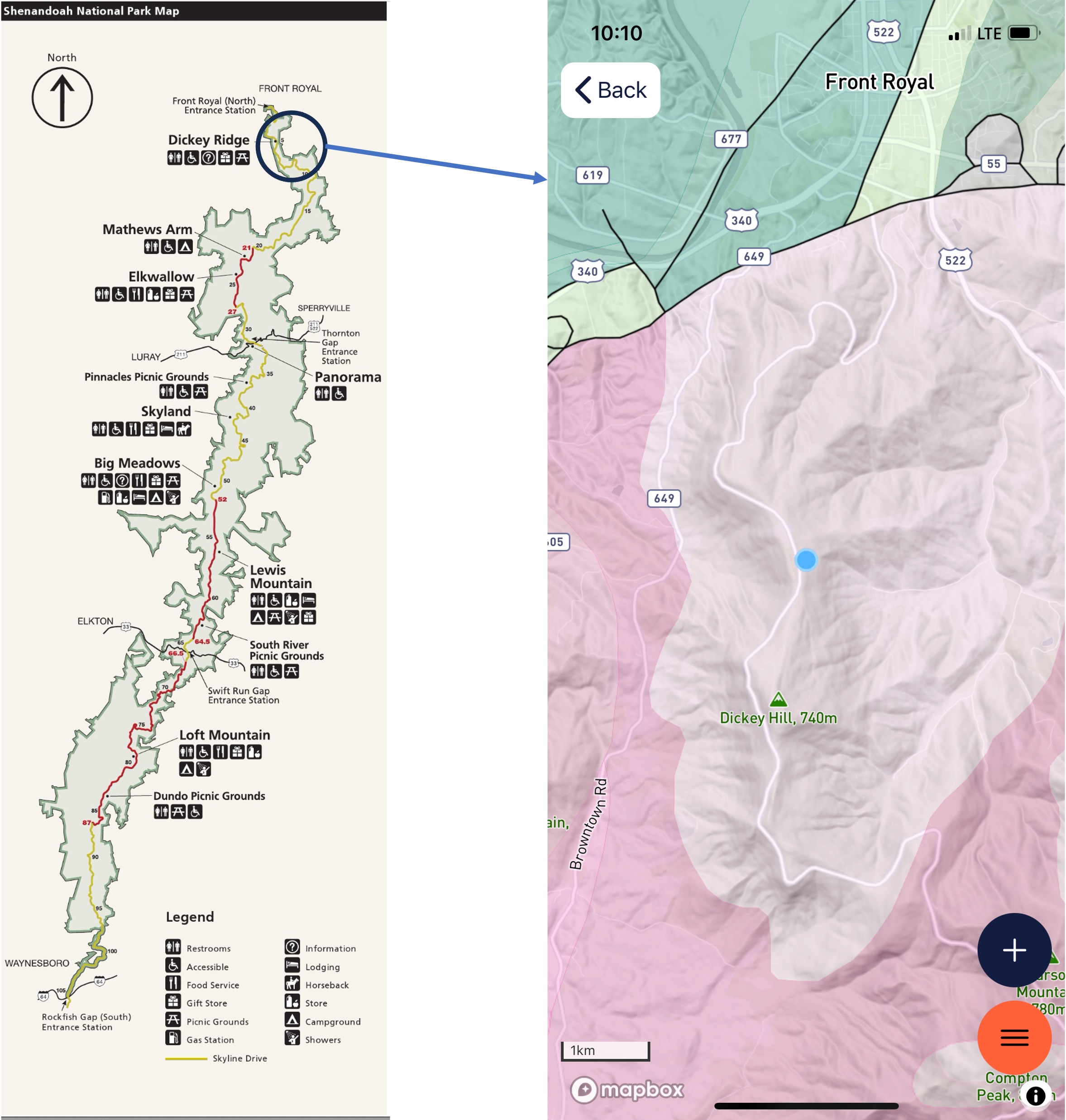 Figure 2. The left image is a map of Shenandoah National Park, which extends along the ridge line of the Blue Ridge Mountains. The study area is circled and a geologic map from RockD is shown in the right image. The blue dot is where we started our climb to Dickey Hill. The rocks of this area (shown in a light-gray color) are the Catoctin Formation (1000 – 485 Ma): metabasalt (metamorphosed to greenschist facies), including some preserved volcanic structures, which are the subject of this post.