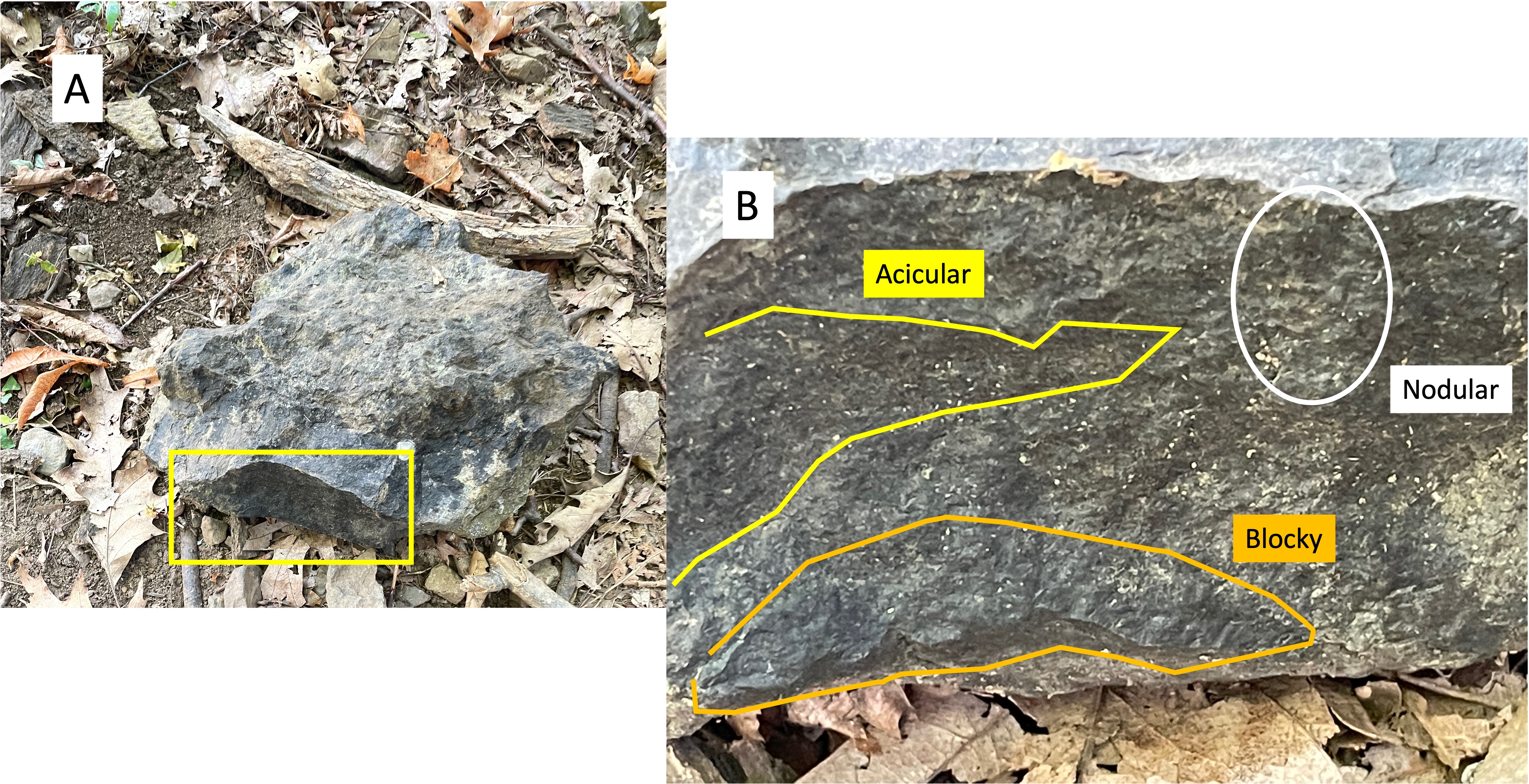 Figure 5. Example of textures found in Catoctin metabasalts: (A) bluish-green boulder with angular form. (B) Close up of fine-scale textures preserved from the original basalt. The acicular sections result from a preferred alignment of minerals, indicating a flow direction; blocky texture indicates that this part of the sample was part of a larger flow and probably more viscous; nodular textures probably result from weathering at some point, possibly soon after deposition. Volcanic flows are not uniform; for example, the basalts of the Catoctin formation are 3000 feet thick but were extruded over tens of millions of years, during which the magma chamber would have changed in composition. These “nodules” are elongate and could be due to recent (last few million years) weathering of acicular textures. Perhaps nodular is the wrong word; these also look a lot like miniature pahoehoe lava, which is ropy when first created.