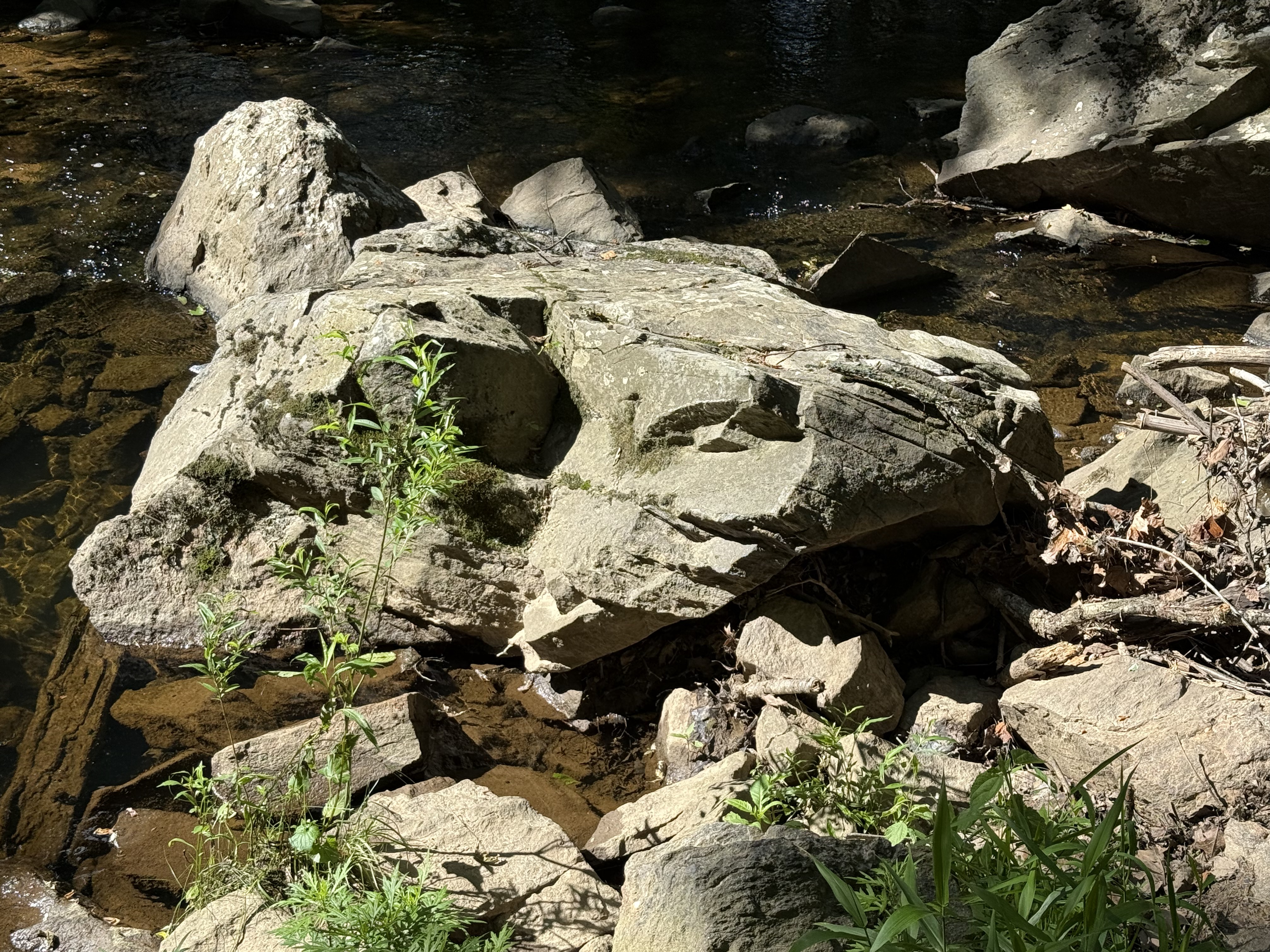 Figure 4. Large block (less than 6 feet in diameter) of schist that has been moderately weathered in place. Note the thin bedding (fissility) between thick layers with a conchoidal fracture pattern (center of image). This is the upstream side, which is pockmarked by rolling and bouncing boulders during high water. Mud becomes schist when buried deeply, retaining the lamination of the original fine-grained sediments, but remineralizing to familiar clays easily at the surface. Mud to schist to mud.