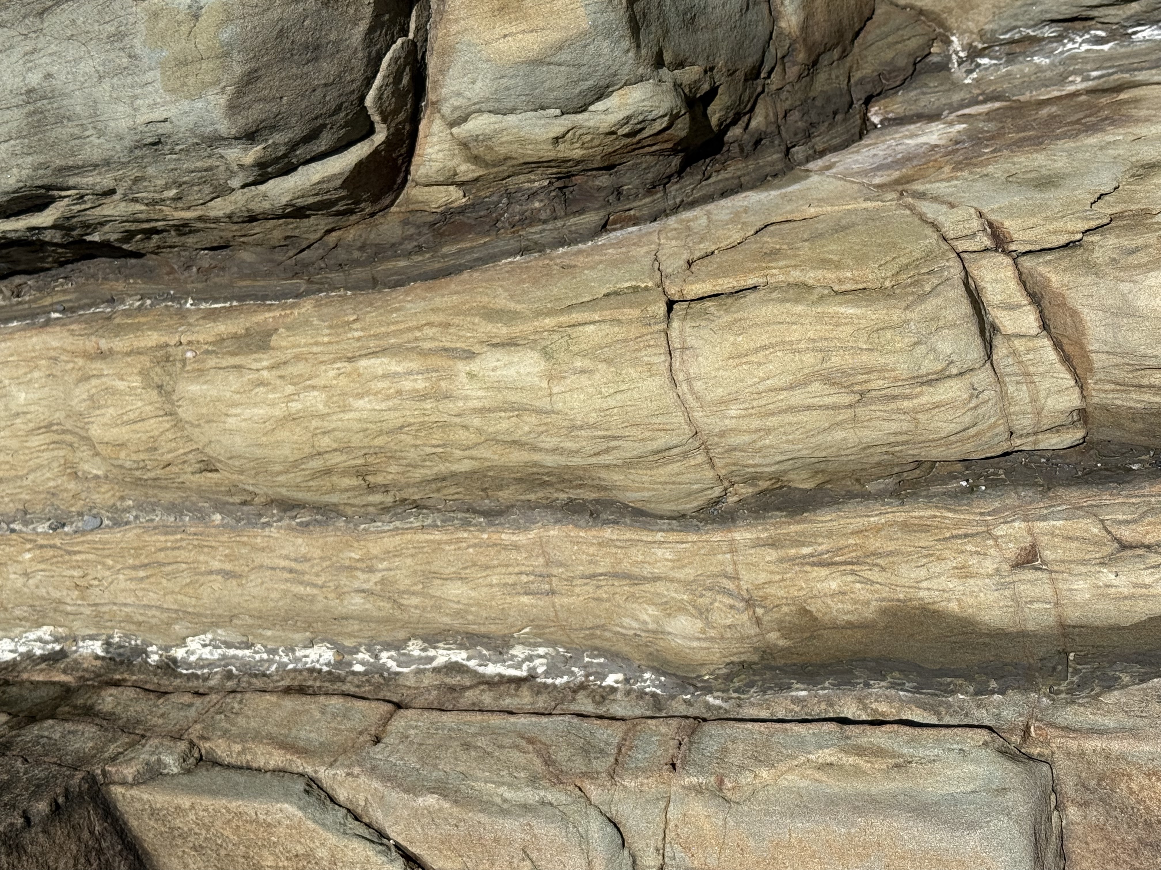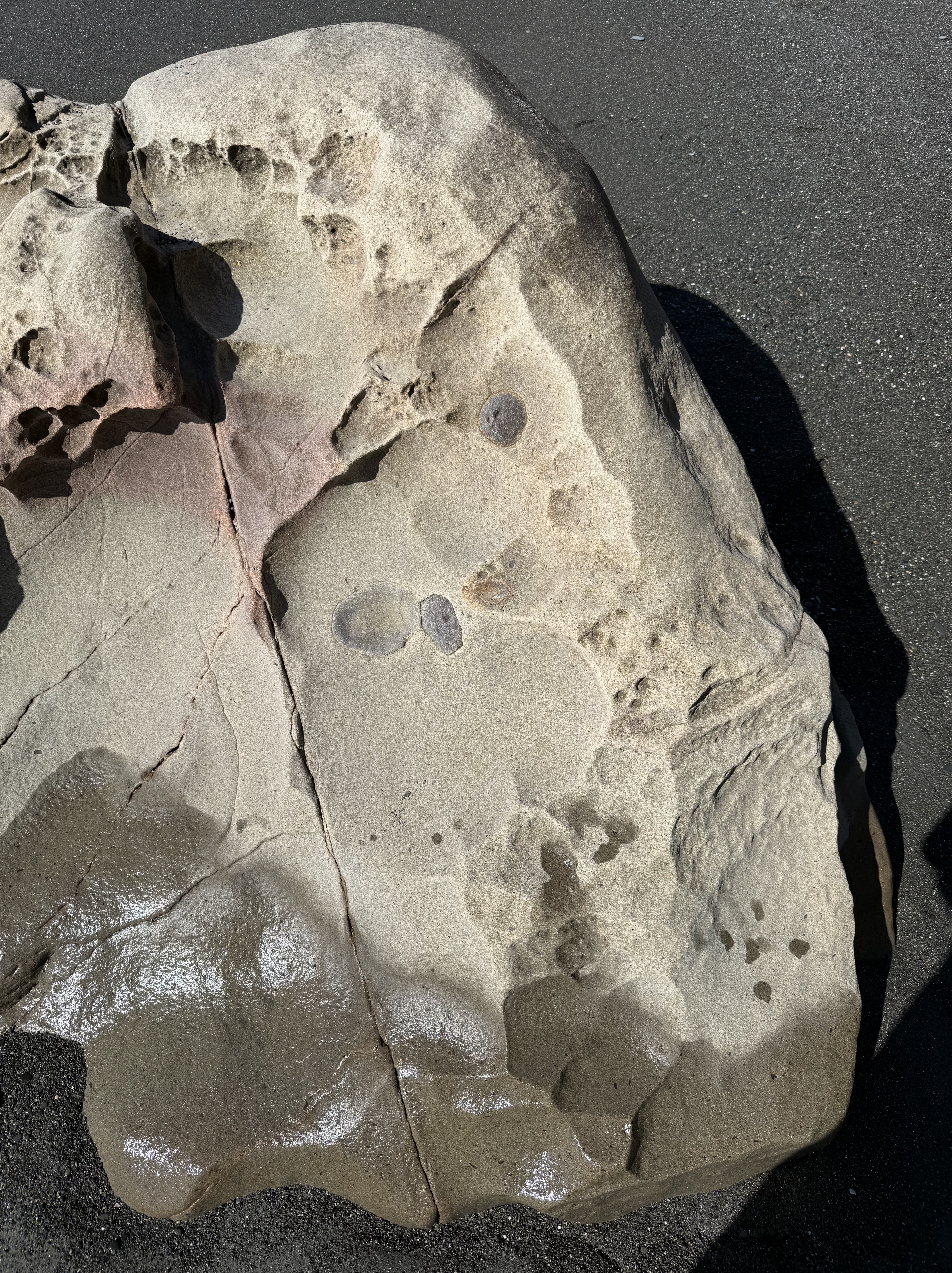 Figure 10. This exposed outcrop within the tidal zone reveals what are probably concretions of iron oxides, formed during early diagenesis. They superficially resemble fossils, but that is not the case. As the sediment was squeezed during burial, incompatible elements like iron formed irregular blobs in an otherwise uniform quartz sand matrix.