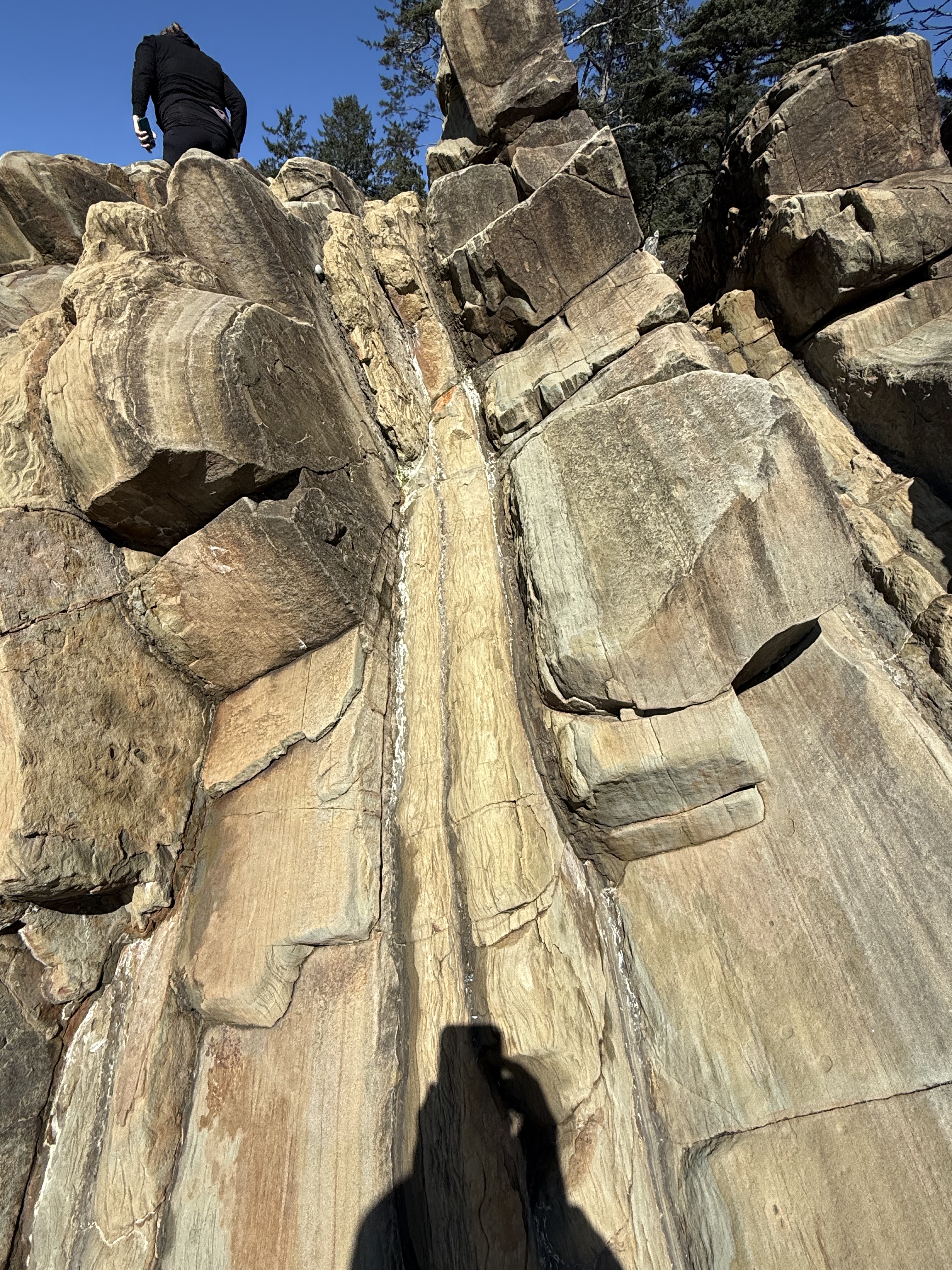 Figure 6. This photo of the Tertiary sedimentary rocks reveals packets of thin-bedded fine sandstone with intercalated dark layers of (presumably) mud. I didn’t see any cross-bedding, which would indicate deposition in a river or nearshore dominated by waves or currents. What is obvious that this ancient (~50-2 Ma) shoreline was receiving sediment from a distant source, probably the volcanic highlands of the modern Cascades (see Fig. 3). Let’s take a closer look at one of those wavy layers.
