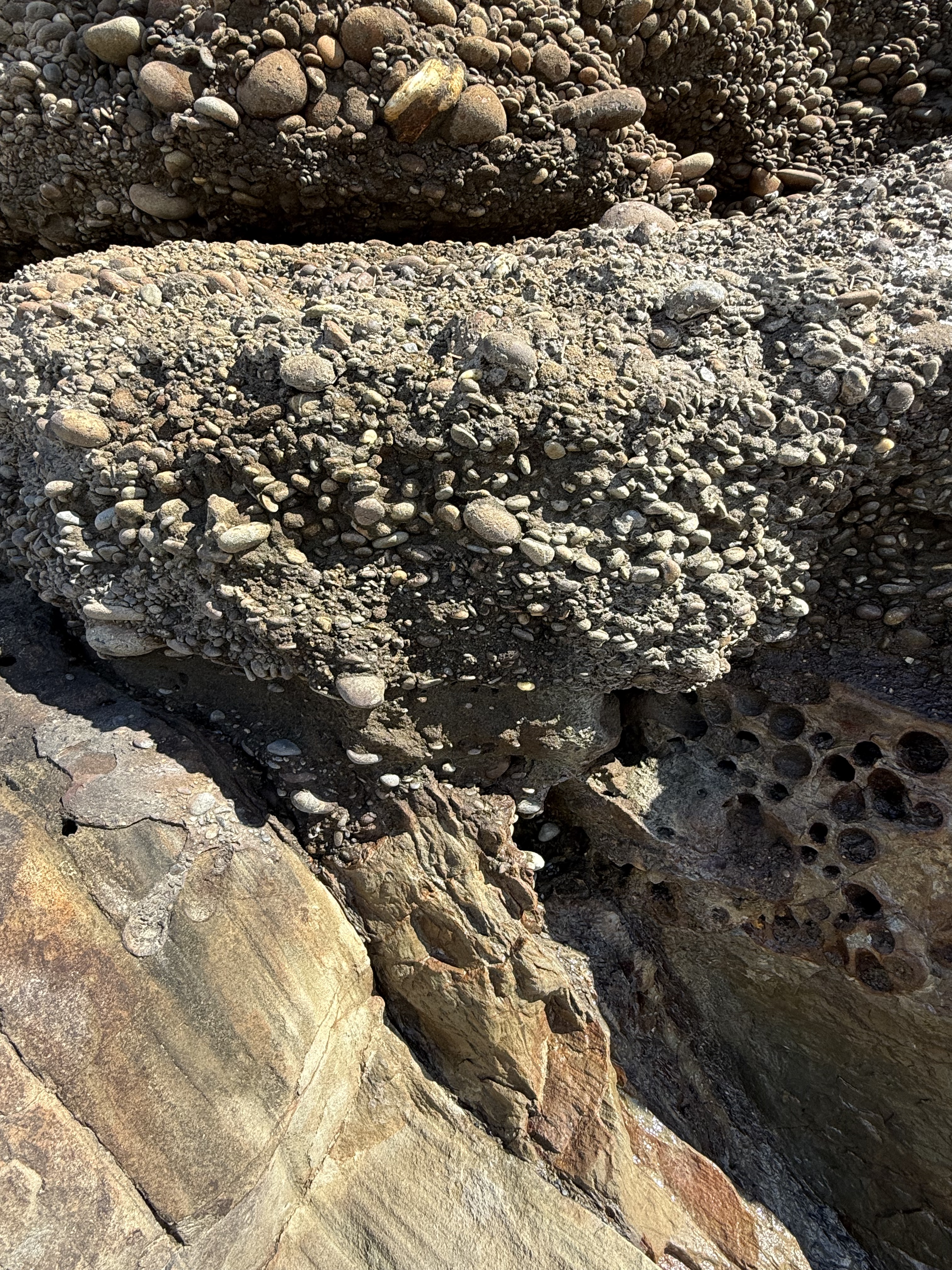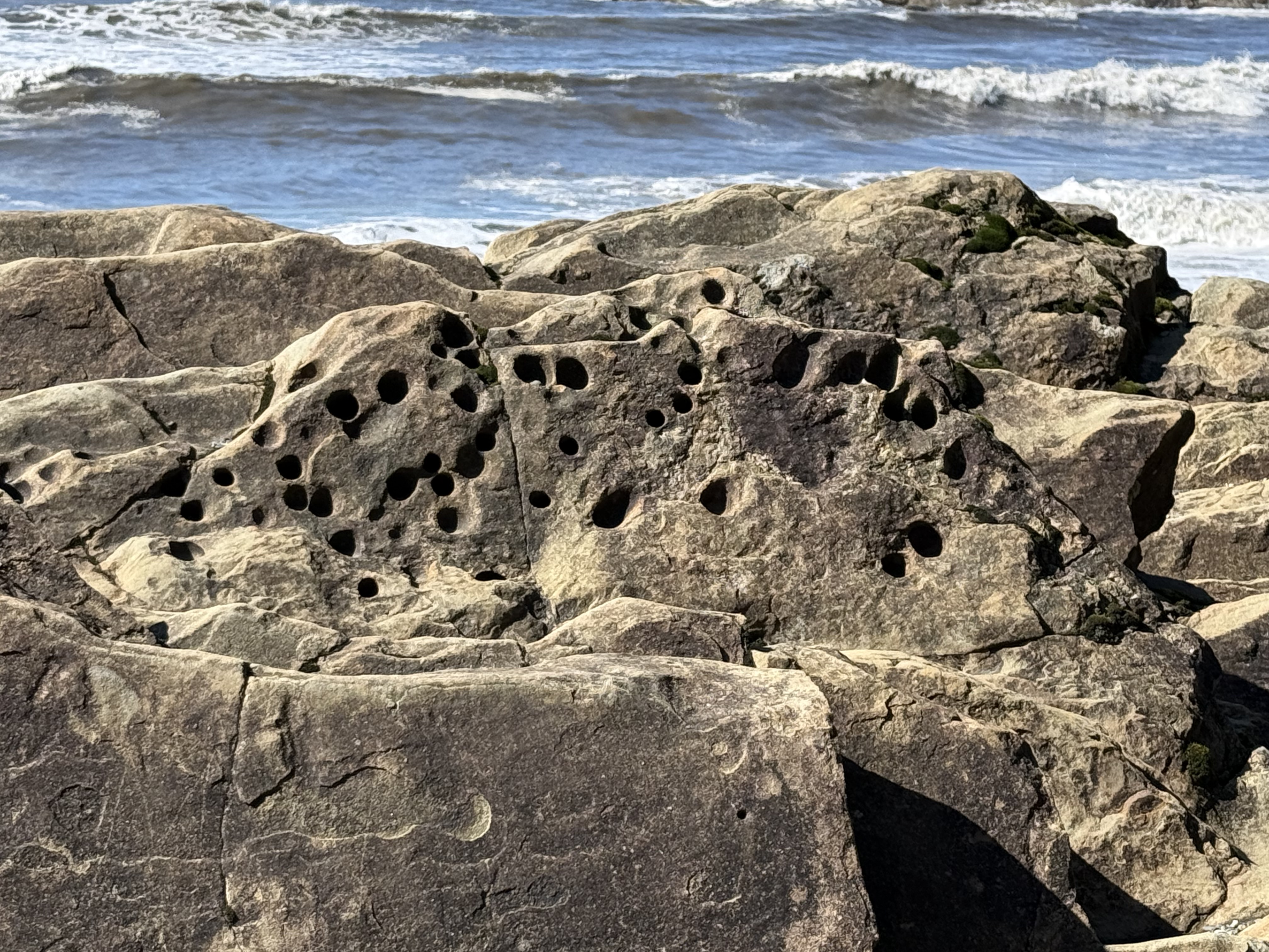 Figure 8. These holes were evident throughout the exposure. They are problematic and probably originated in several ways; however, one plausible explanation is that soft-bodied animals like worms burrowed in the sediments and their burrows filled with sediment with a different composition (e.g. fecal pellets). These channels then preferentially eroded when subjected to the harsh nearshore environment in which they are found. The presence of such holes at the unconformity (see Fig. 5) proves that they predate deposition of the overlying glacial till. Unfortunately, such trace fossils don’t tell us anything about geologic age, only that this seashore was teeming with life.