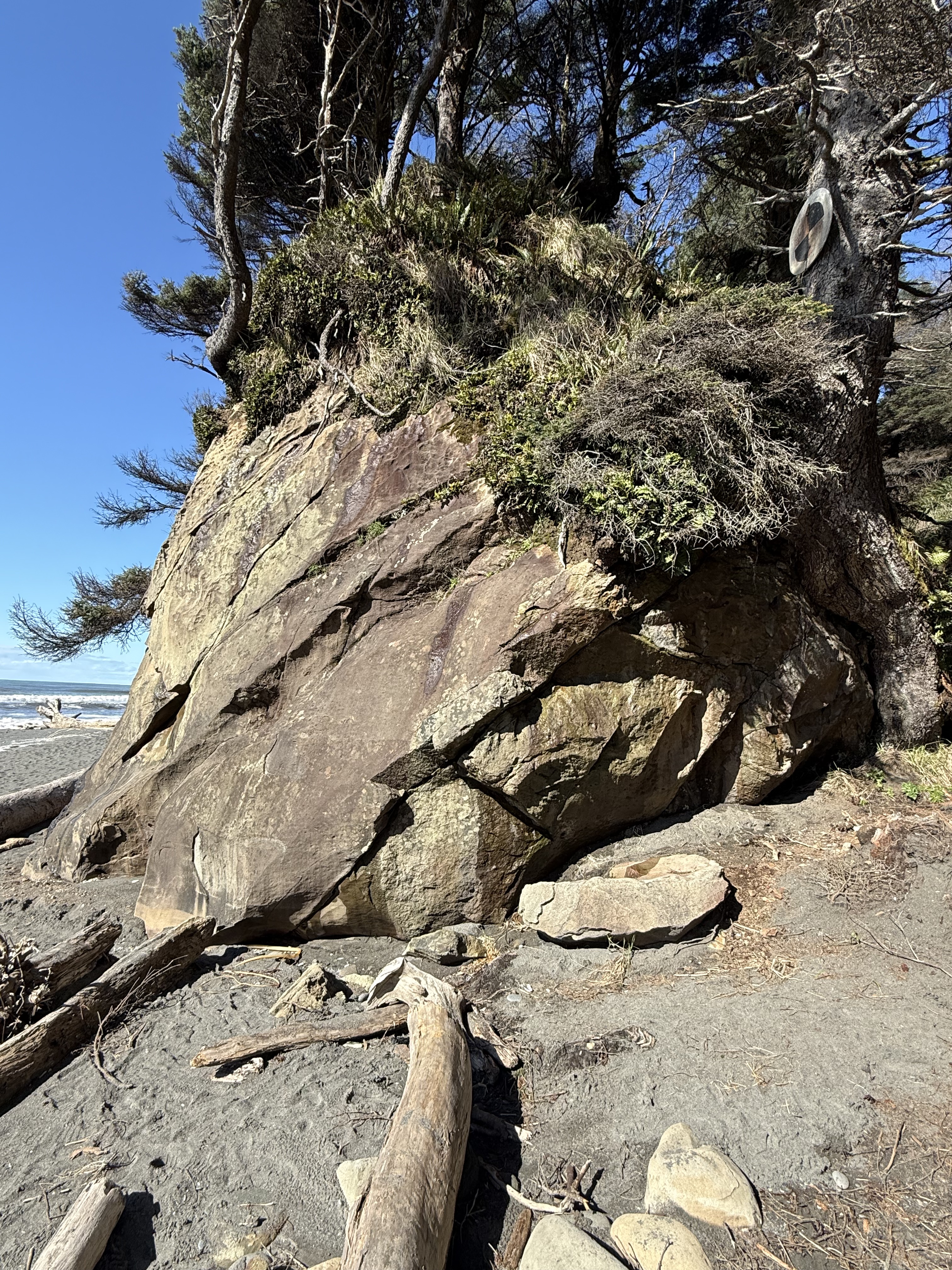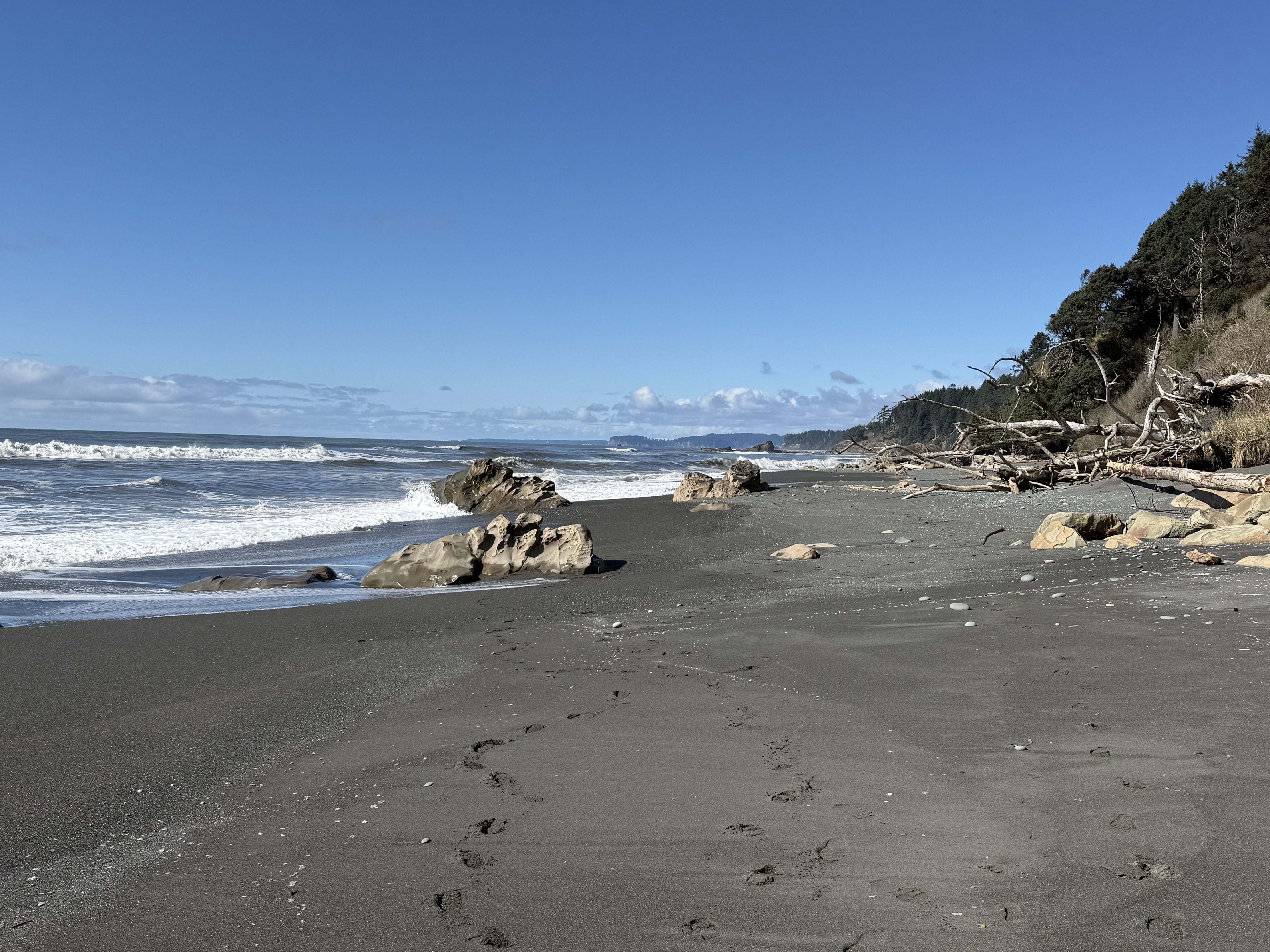 This coastline was part of the Cascadia subduction zone during most of the Tertiary period. Sediment, including a lot of sand, was eroded from rocks being uplifted further inland where volcanism was active, especially during the Eocene (55-35 Ma). Beaches like those we see toady were common, as well as the various depositional environments found along the Olympic peninsula, including fluvial and submarine fans, beaches, and cliffs. But no glacial sediment.