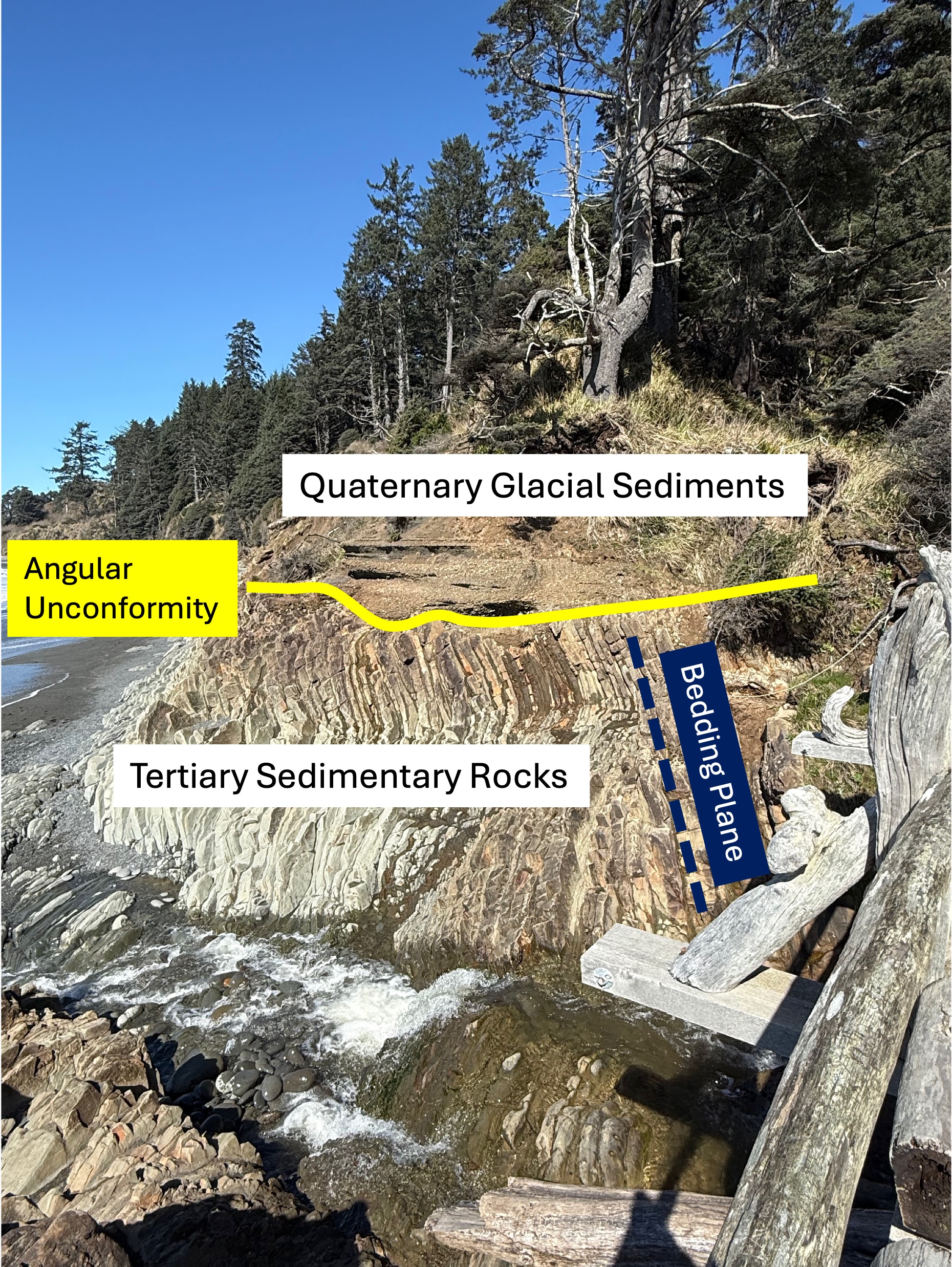 Figure 4. This photo has been marked-up to highlight what might not be obvious to a non-geologist. First, older sedimentary rocks have been tilted to a high angle (dark blue bedding plane line) by faulting, as suggested in Fig. 3, and exposed to erosion at the surface. This erosional surface is shown by the yellow line. These Tertiary sediments were buried several miles beneath the ocean surface where the grains were cemented by heat and pressure. We don’t know exactly when this occurred or how long this process took, but they were later overlain by younger glacial sediments during the Pleistocene epoch (2.4 Ma to present). The age of sedimentary rocks can’t be pinned down unless they contain material datable by radiometric methods or, more qualitatively, by the fossils they contain. Sandy sediments don’t contain fossils very often and I didn’t find any radiometric ages in either Rock D or the USGS geologic map, so I guess the Tertiary date is the best we can do for now.