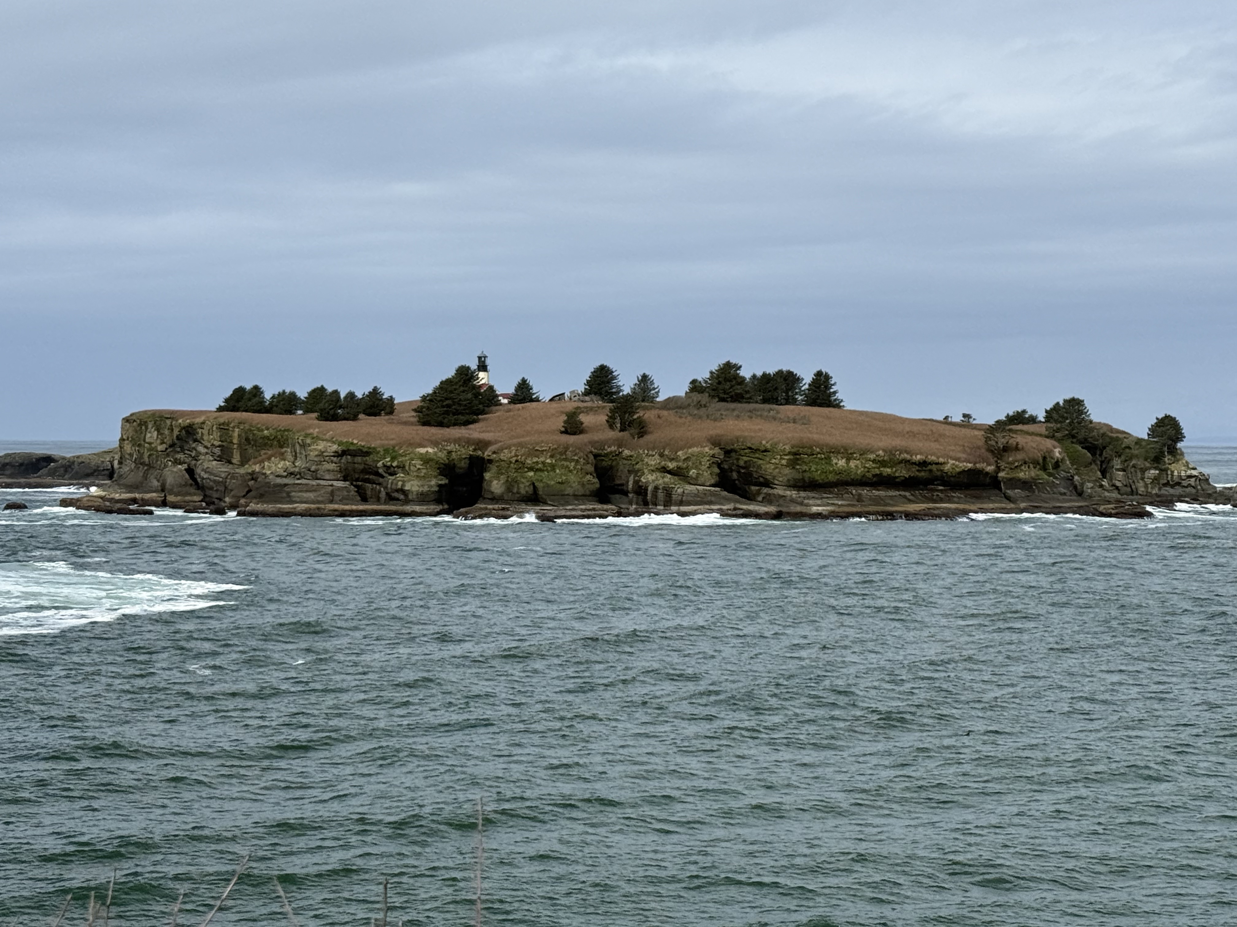 Figure 3. The sea stacks seen further south have been replaced with rocky islands like Tatoosh Island, which has a light house. Pacific Ocean seafloor (Juan de Fuca tectonic plate) is being actively subducted along the Washington-Oregon coast at about 2 inches/year, but the plate tectonic geometry is complex in this area. This could partly explain the large number of faults seen in Fig. 2 as well as the high elevation of bedrock. Maybe.