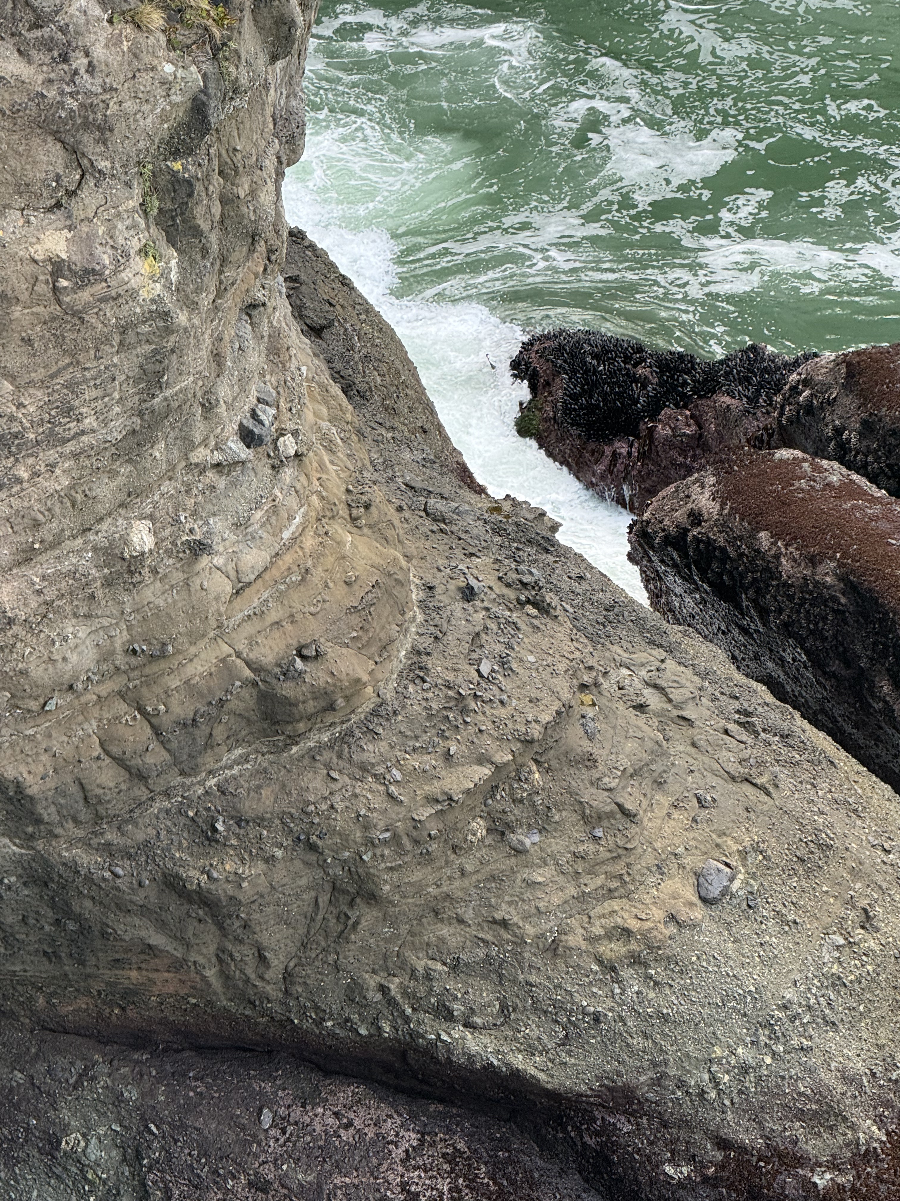 Figure 4. This photo was taken looking down towards the wave-terrace on the south side of the lookout point. For scale, the largest boulders are a couple of feet long, based on exposures at the surface of the trail. This is a textbook tectonic breccia. However, note that most of the rock fragments are rounded, so they have been transported some distance before reaching their final resting place. Some of the layers are relatively uniform with a few large boulders whereas others resemble the cobblestones we saw at Ruby Beach. Each bed might represent a single depositional event (like a landslide) or accumulation over years. These are marine rocks, deposited on a submarine fan, probably as turbidity flows. The process that created them is occurring now a few miles offshore, where the rocky outcrops we saw are eroding and supplying large and small fragments to a steep continental shelf.