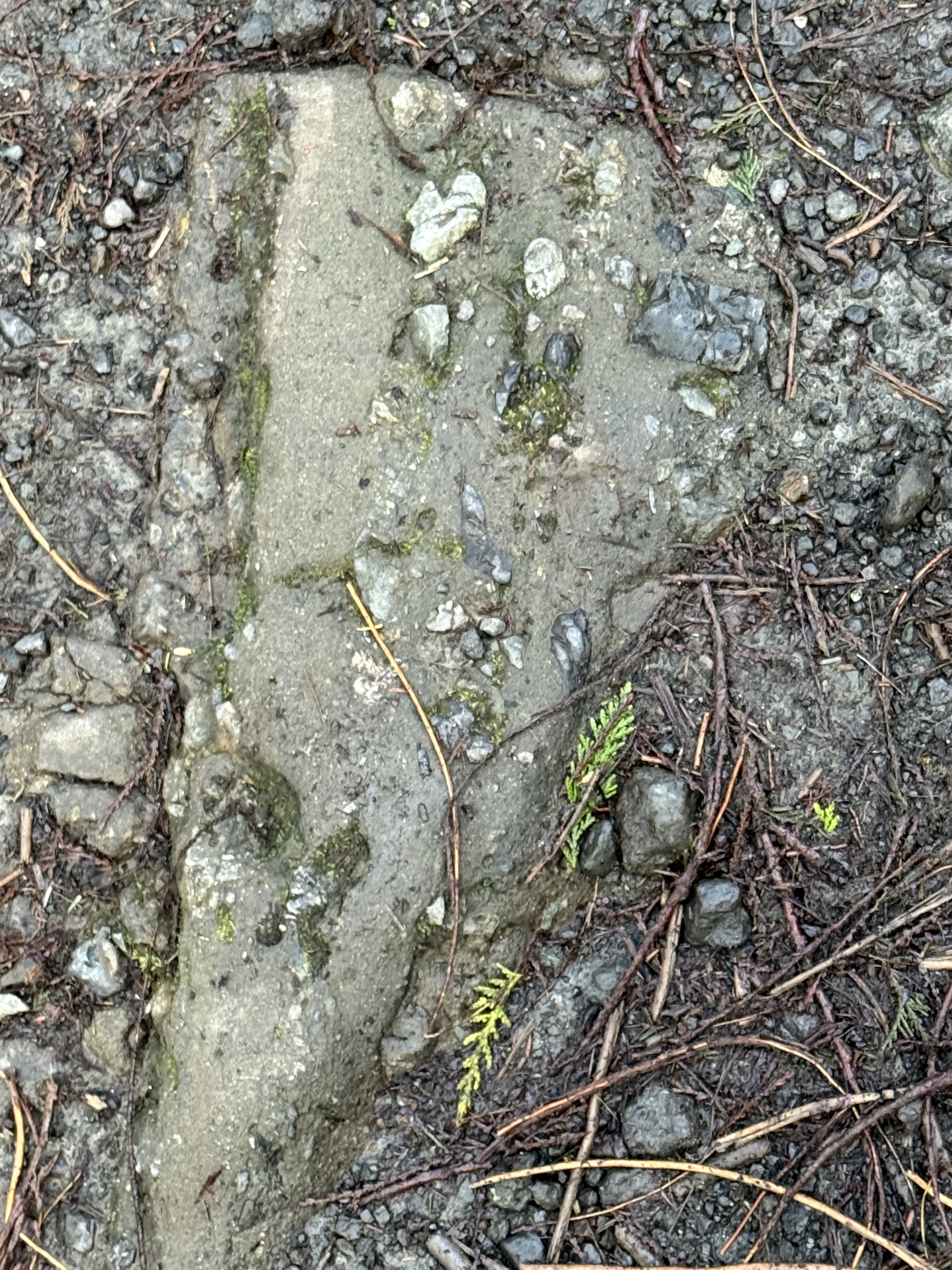 Figure 5. This image looks like run-of-the-mill gravel like you see on pathways and drives, but it is Eocene rock, and I mean solid rock (Note the large, gray piece protruding from the cliff in Fig. 4). This angular slab is about a foot in length. There is no Pleistocene glacial till in this area, even if the ground looks the same. This is a picture frozen in time, where an angular piece of what looks like sandstone, but could be andesite, slid downslope along with smaller fragments.