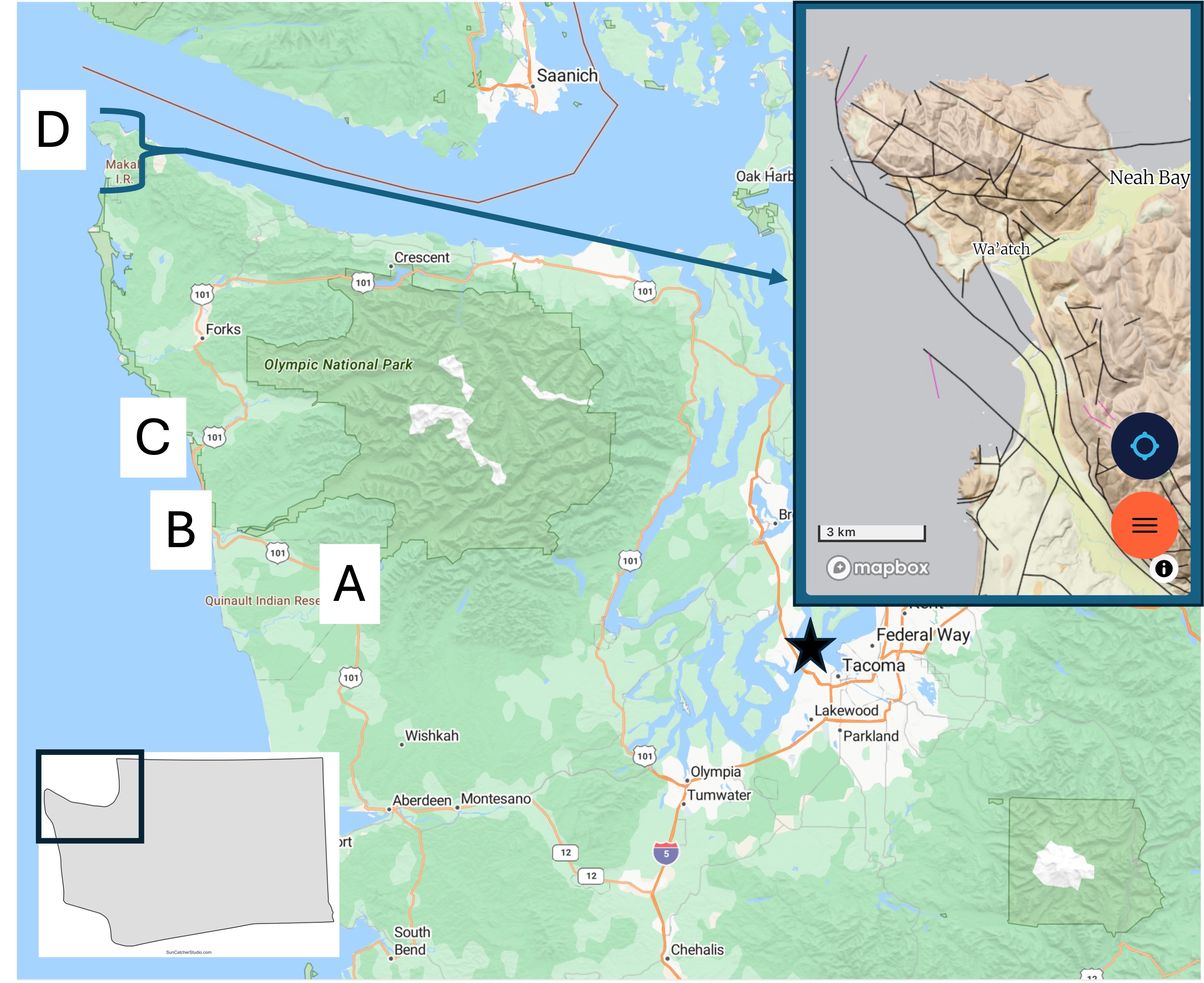 Figure 2. Today’s post takes us to Site D, which is shown in a geologic map from Rock D in the inset map. The rocks are a mixture of sandstone and conglomerate of Eocene age (56-34 Ma). This is the same time that the lower Cascades were being created east of Puget Sound. Note the large number of faults (thin lines) shown in the inset map. Many of these are strike-slip faults with motion of the opposing crustal block to the left, which would explain why the sedimentary layers in seen in Fig. 1 are almost horizontal, dipping slightly towards the sea.
