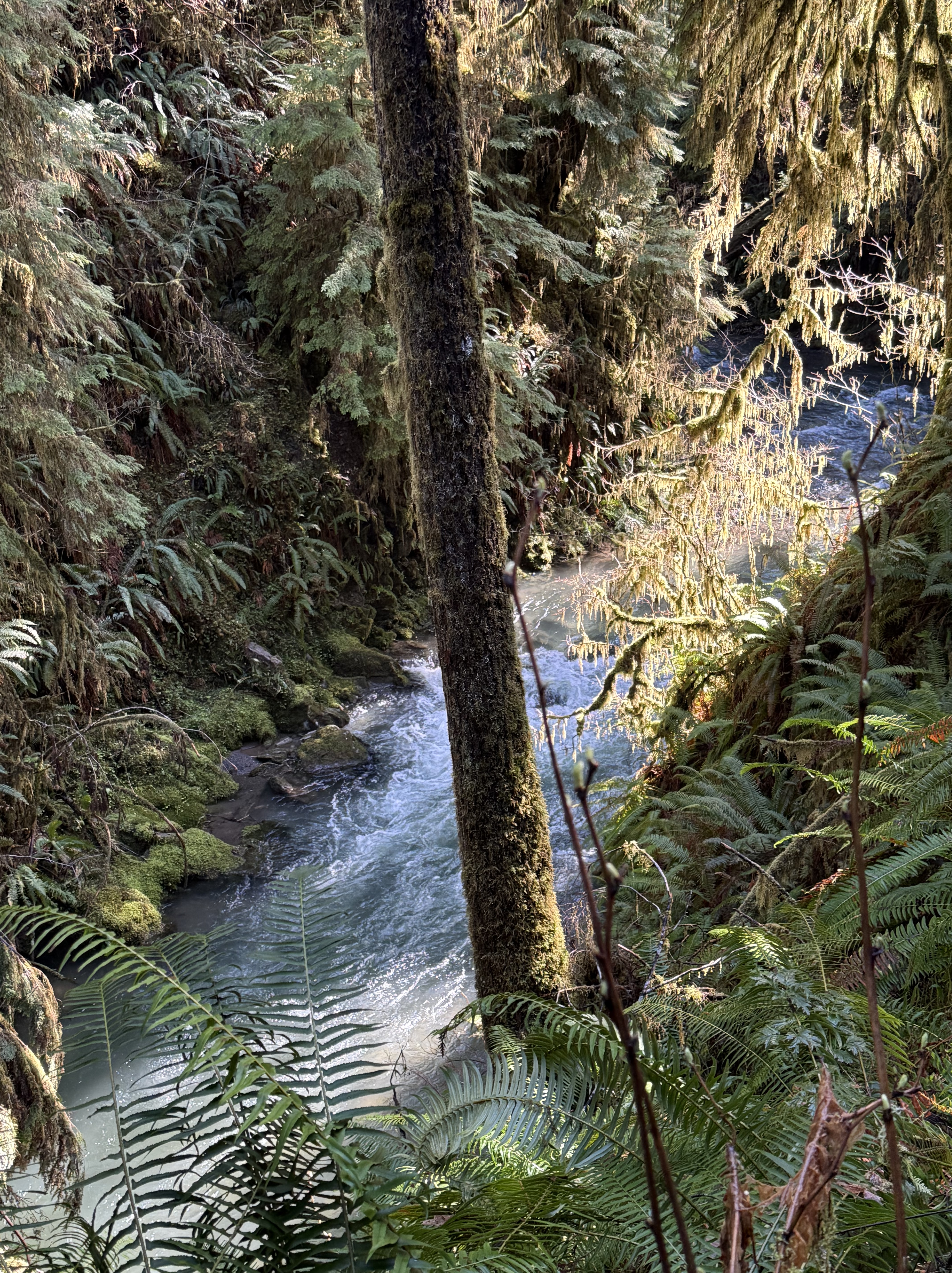 Plate 1. That raging stream about 50 feet below me is one of hundreds draining this temperate rainforest, which gets about 12 feet of rain per year. Note the ferns, which are everywhere, even in the temperate forests of northern Virginia. Ferns must be the most common plant in cooler forests. I am in a narrow strand of Olympic National Park that has never been logged. This is primordial nature, viewed by a geologist, but I’ll do my best.