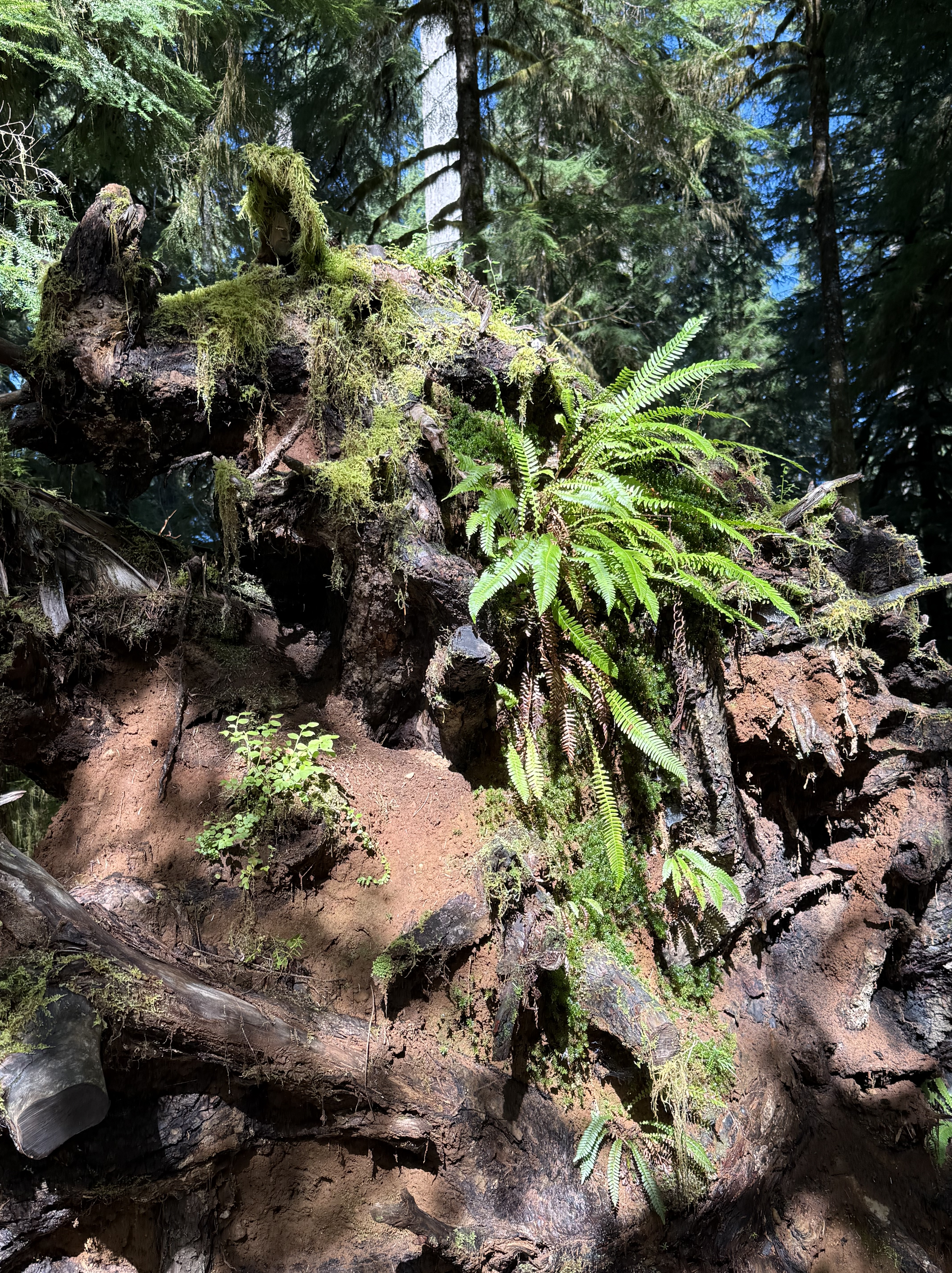 Plate 4. This pile of debris is a large log turning into compost and supplying nutrients to a variety of plants. The top of the photo shows the base of a young tree growing out of all this chaos. According to CoPilot and the Olympic National Park map, this area has never been logged, so I am in wonder of this pile of “forest garbage”. Is that sandy soil I see? Where did it come from? I don’t know.