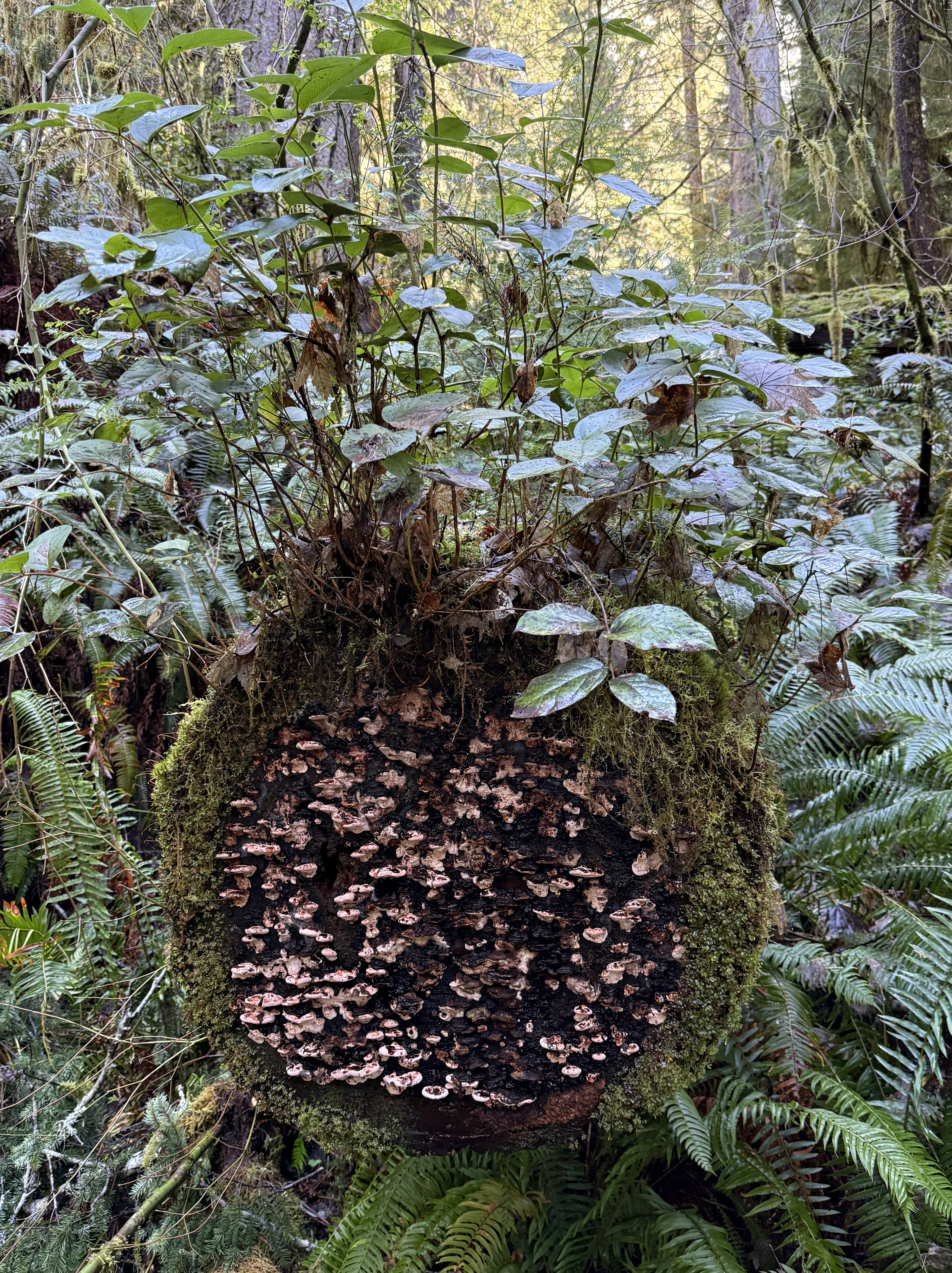 Plate 6. This miniature ecosystem caught my eye, but I had to turn to CoPilot to get an idea of what’s going on. As a tree trunk decays it goes through five stages: 1) moss; 2) liverworts; 3) fungi; 4) shrubs; and 5) young trees. This one seems to be in stages 1-4. I didn’t see any seedlings on it. The shrub is probably huckleberry and the mushrooms a bracket fungus, probably Trametes or Stereum.