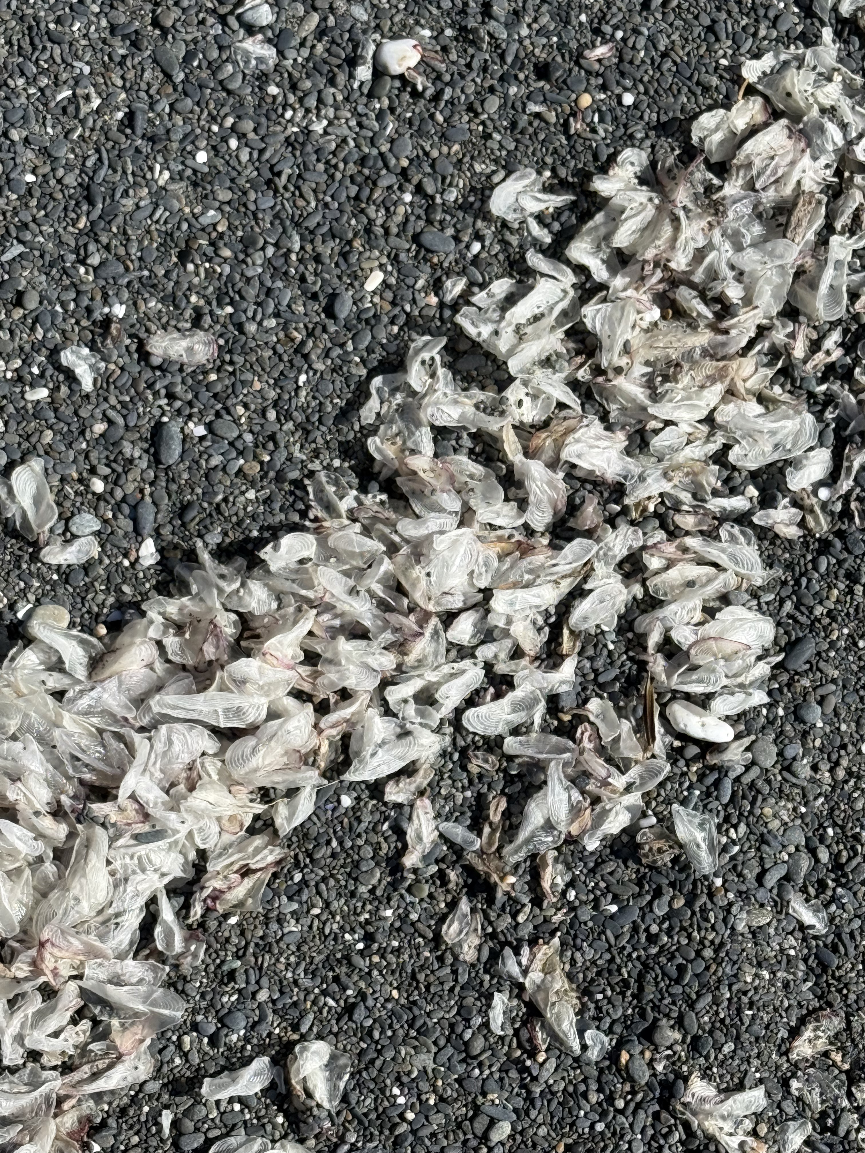 Plate 10. This one was a doozy. These objects are one-two inches long, thin, translucent, and oval in general shape. At first, CoPilot suggested insect wings (until I told it the size), then gull secondary feathers (until I said, “no way”), then settled on small fish cranial bones–e.g. the opercula, the bone that covers the gill. I asked for references, but it supplied me with titles and no links (how did it find them?). I spent longer on this photo than I wanted to. I don’t fault CoPilot for its ambiguous response because I found nothing when I looked very specifically. This phenomenon is either so common that no one bothers mentioning it, or infrequently observed that no serious beachcombers have stumbled across it. I’m going to have to agree (for now) with CoPilot that these are small bones from a school of fish that was decimated by either predation, coastal fishing, or disease and only these translucent cranial bones survived by floating, until waves concentrated them on this beach. This is the only beach where I saw them. I guess there are no easy answers to some questions–unless someone who reads this is a marine biologist.