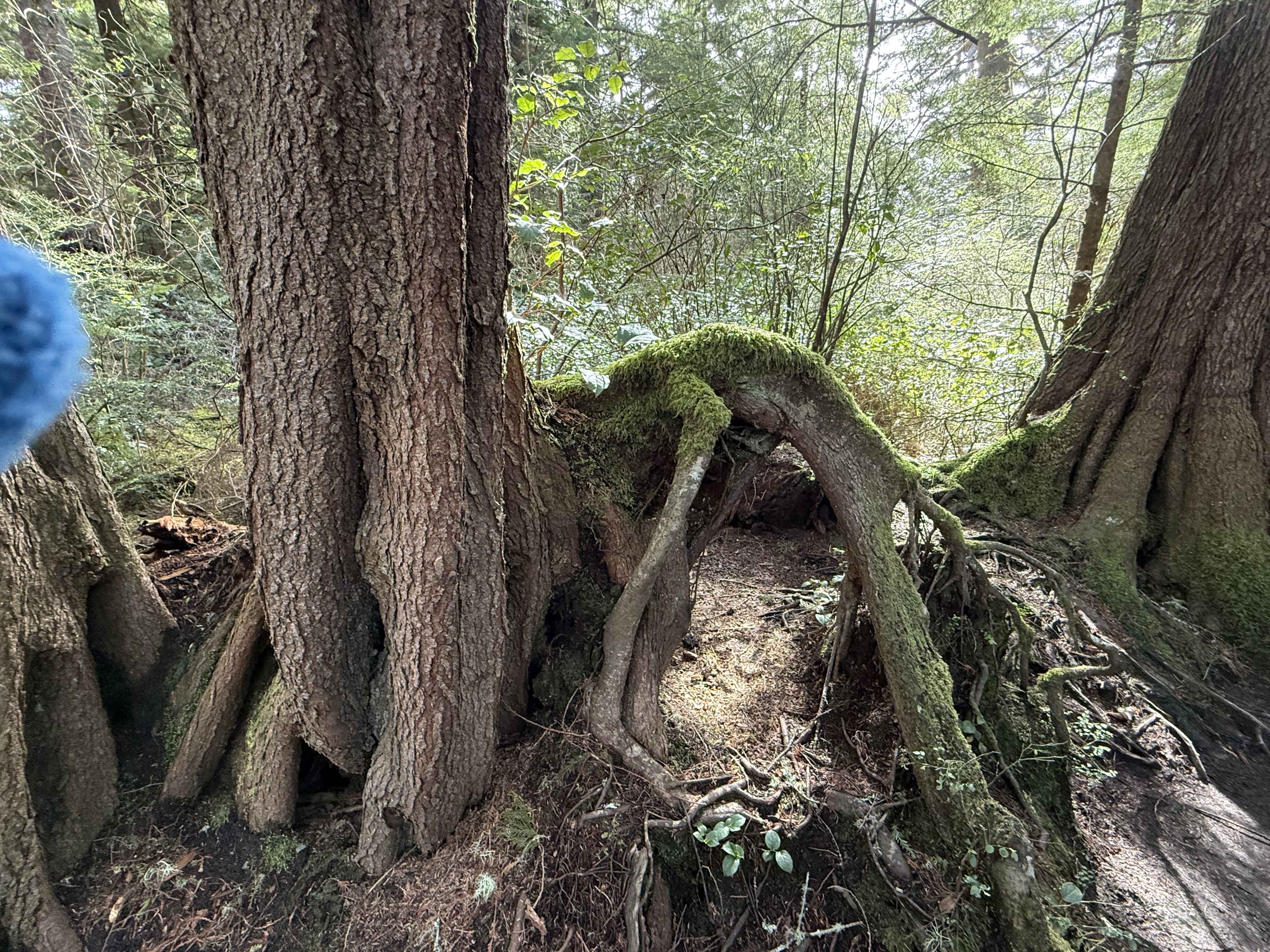 Plate 12. I had to throw this photo in because the root growing out of the tree(s) on the left looks like a dog that got its head caught in a hole, and died there. Its limbs of limp. Overactive imagination, I know. Nevertheless, this is a bizarre image because the dog is lying on top of a mound of soil. I’d bet there was a stump there that has decayed because the trees visible in this image are both composed of multiple trunks. A large tree died here (like the dog) and these are its adopted offspring. I would add that Cape Flatters, which is part of the Makah Reservation, has never been commercially logged. This is old-growth forest and this is a naturally occurring phenomenon.