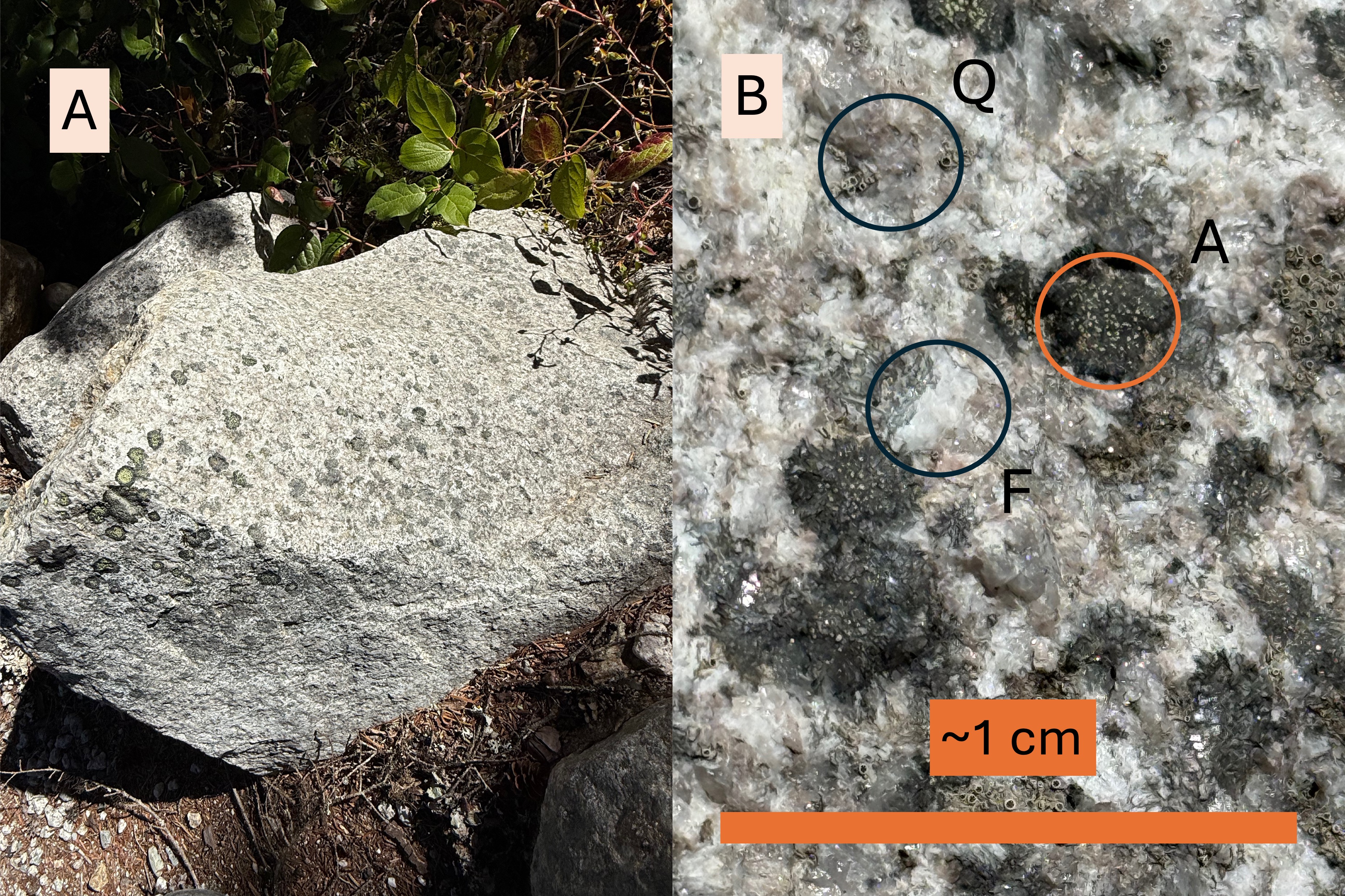 Figure 4. (A) The rocks within the park are fairly uniform in composition because they were intruded as part of a single pluton. This boulder shows the typical salt-and-pepper appearance of dioritic rocks. This sample is relatively fine grained, which indicates that it wasn’t emplaced more than a few tens of kilometers deep; i.e., smaller crystals indicate faster cooling which occurs nearer the surface. (B) Close-up at the highest optical magnification available on my phone, about 5X. RockD generally describes the igneous rocks from this area as granodiorite, a type of diorite that contains 20-60% quartz (labeled Q in the photo), and primarily feldspar (labeled F) that contains sodium and calcium with little potassium. The dark minerals are amphiboles (labeled A), probably hornblende. These are typical granitoid rocks from a subduction zone.