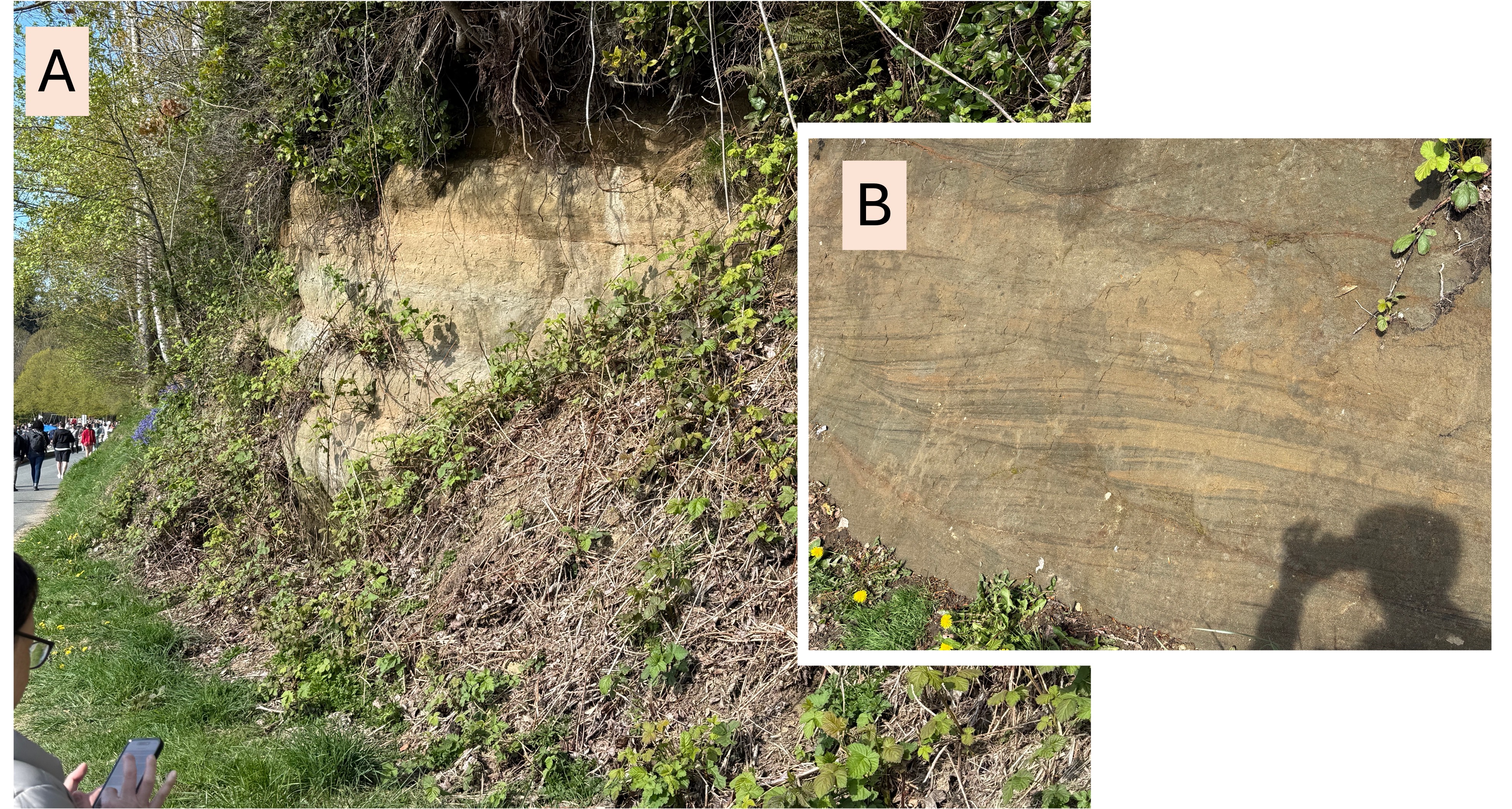 Figure 2. (A) Exposure of Late Cretaceous (100-66 Ma) sedimentary rocks at Stanley Park (bottom center of Fig. 1B). These rocks look unconsolidated, but they are actually well cemented. (B) Close-up showing lamination and sets of unidirectional cross-bedding, which indicates transport in a stream rather than a marine environment. Transport was generally to the right, but each set of cross-beds is a slice through a three-dimensional form like the bars seen in modern rivers.