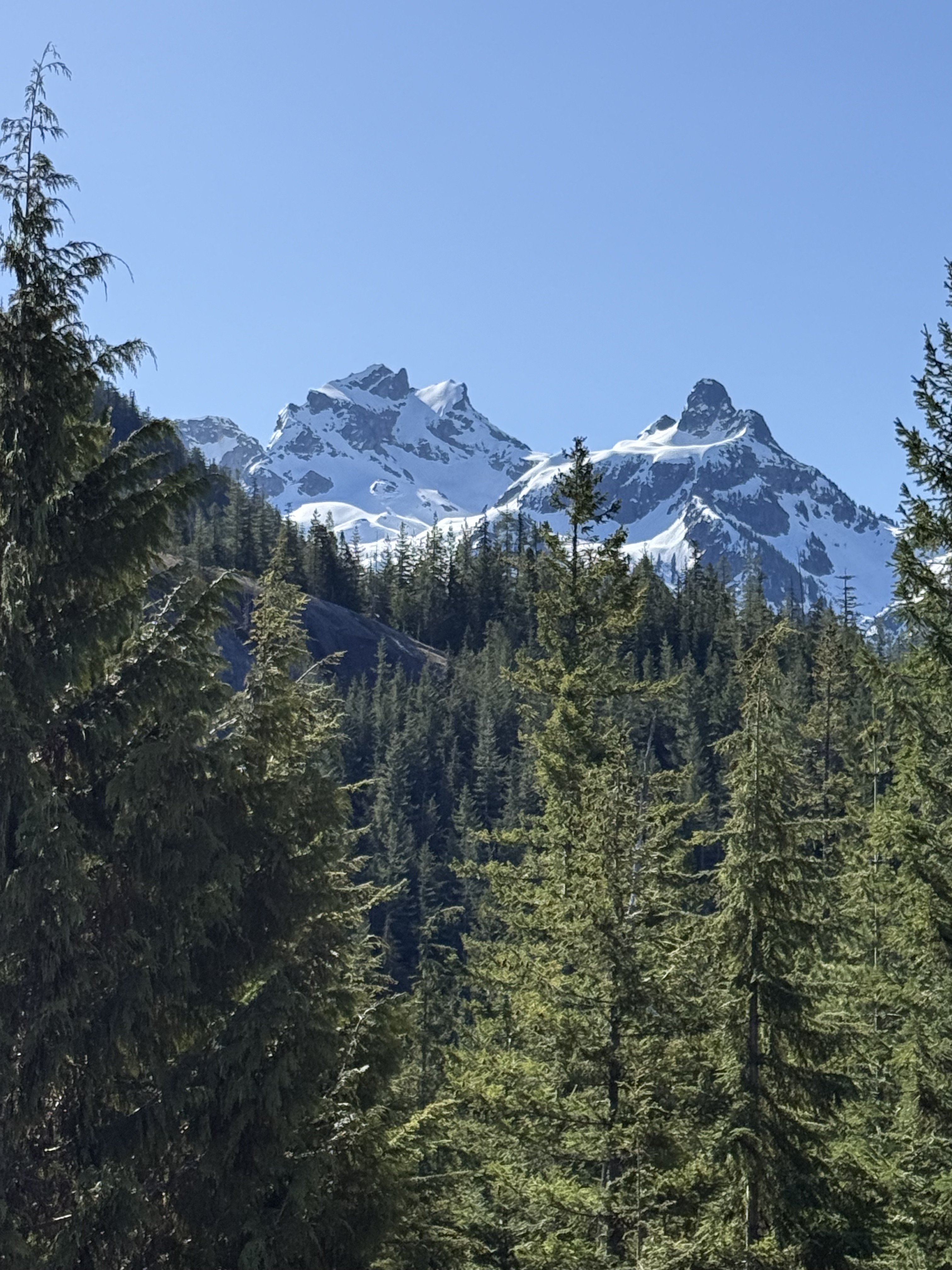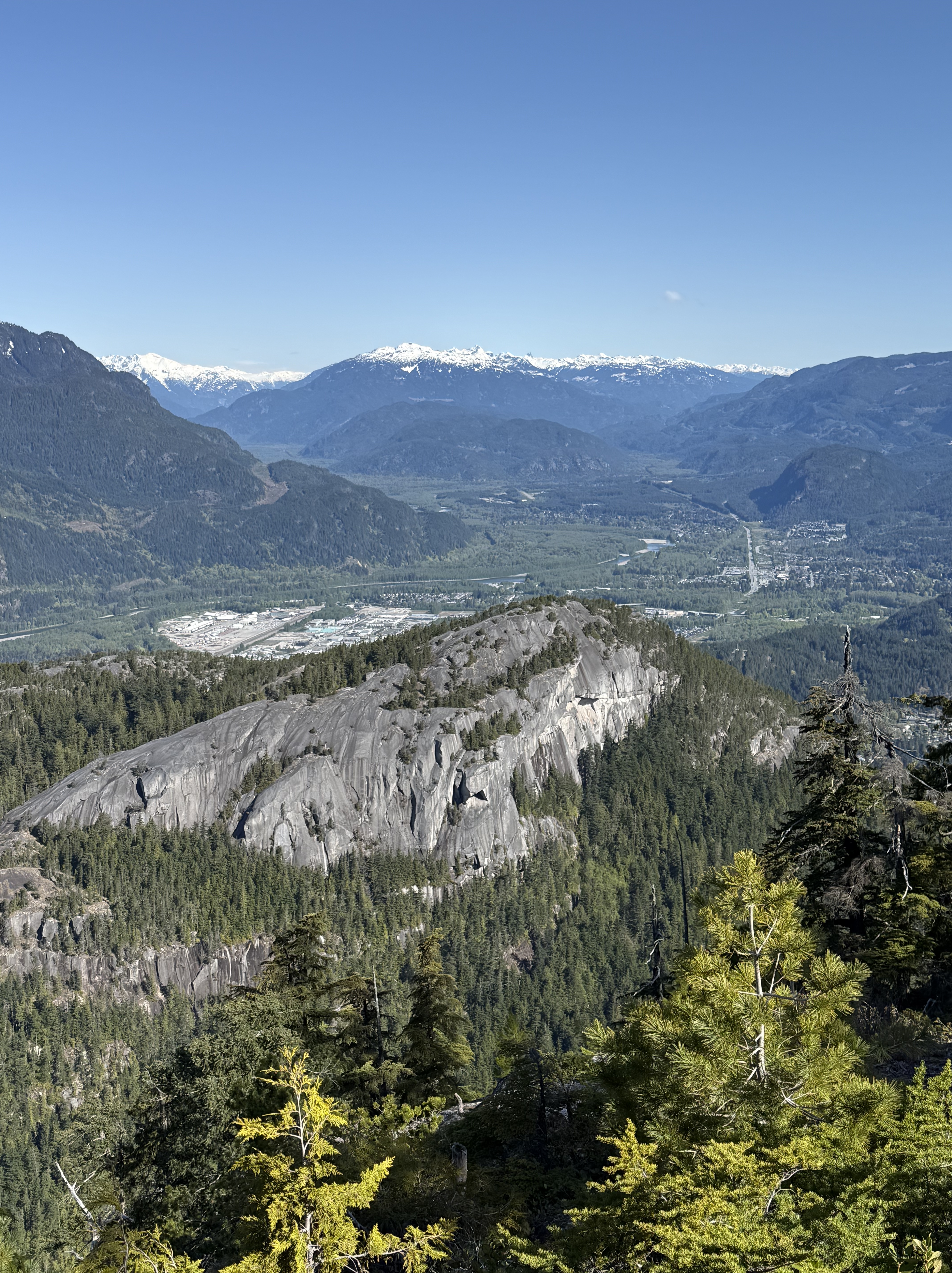 Figure 3. View looking northward from Squamish and Chief Viewpoint park (circled in Fig. 1C). Besides offering a breathtaking view of the northern Rocky Mountains, this photo reveals several interesting geologic phenomena. The small peak in the foreground is solid diorite that was intruded between 143-66 Ma more than 20 km beneath the surface at that time. It has been uplifted as overlying rocks were removed by erosion. It may represent a single intrusive episode because typical plutons are 2-3 km in diameter; batholiths comprise multiple intrusions spanning millions, if not tens of millions, of years. Note the lineations running up the side. These reflect the scraping action of ice sheets during the last two million years as they flowed towards the sea. The valley in the background is the classic U-shape caused by the advance of glaciers. It has been filled in by glacial deposits very similar to those found in NW Washington. Glaciers in this area originated locally and were up to several kilometers in thickness. They flowed both towards the sea and inland to form a continental glacier.
