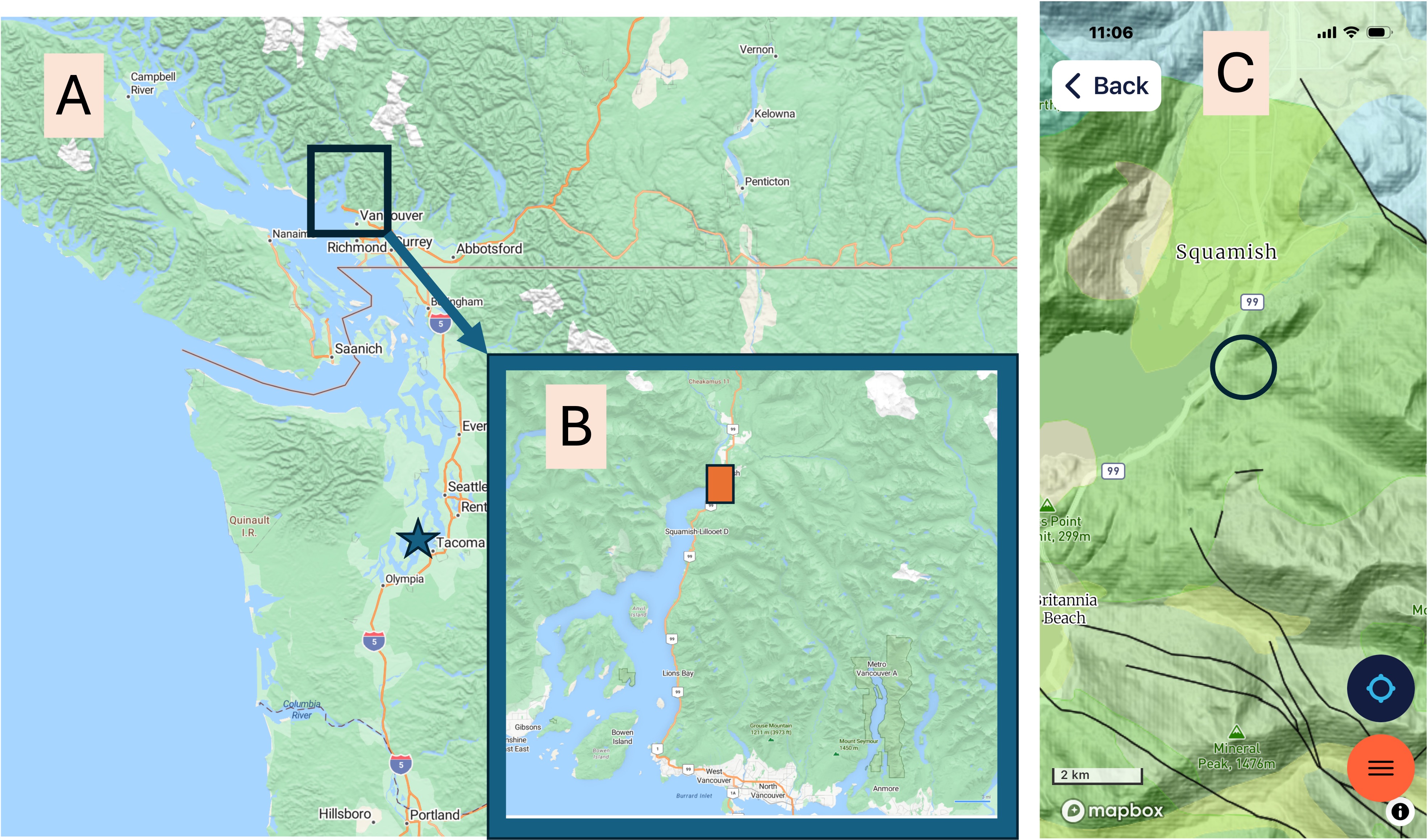 Figure 1. (A) Regional map showing the location of the study area in SW British Columbia, about 230 km (140 miles) north of Tacoma (starred location). (B) Detail map of the inlet (I couldn’t find a name for it), showing the location of the Sea-to-Sky gondola I rode to Squamish and Chief Viewpoint park. (C) Geologic map from RockD, showing the fairly uniform occurrence of diorite intrusive rocks intruded between 143 and 66 Ma (covering the entire Cretaceous geological period). The town of Squamish sits at the head of the fjord. Faults of unidentified type (i.e., normal, reverse, strike-slip) are common but don’t appear to control the location of major drainage basins, which have been excavated by glacial action during the Pleistocene epoch. The circle indicates the area reported on today, except for Fig. 2.