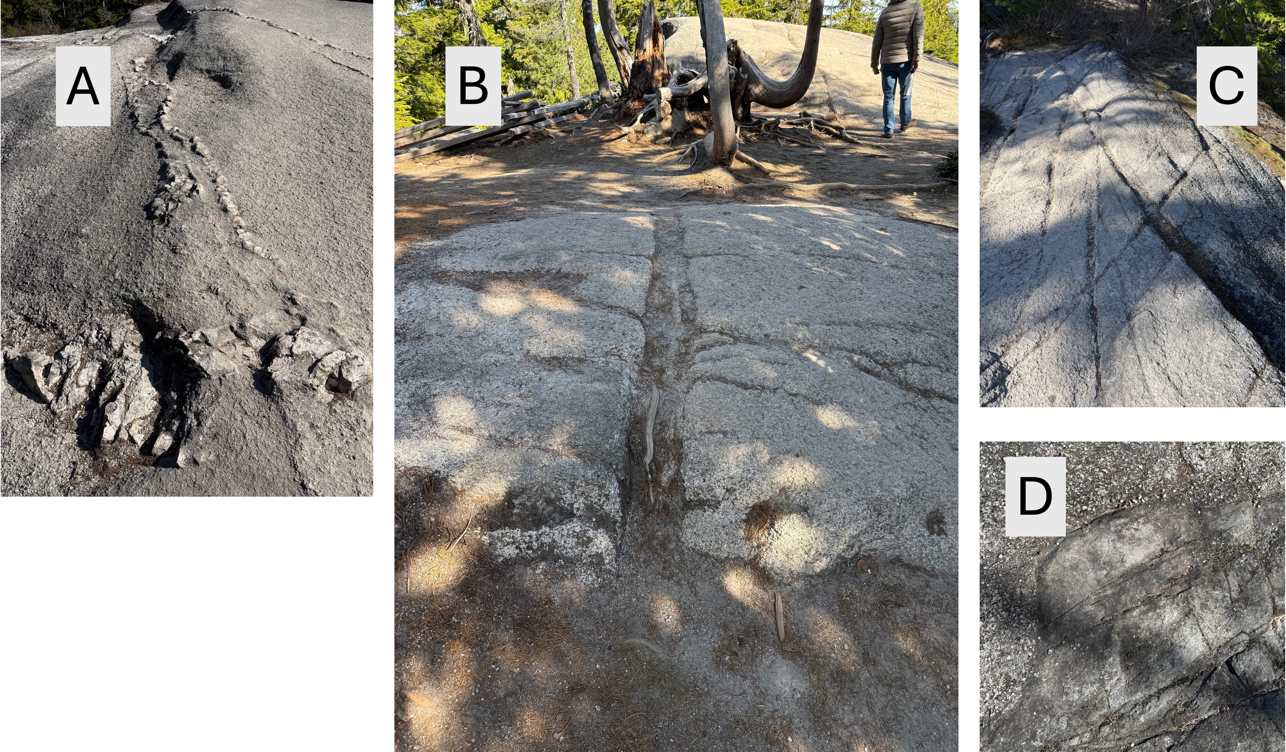 Figure 5. (A) Surface showing a vein filled with a harder mineral that is probably quartz. The softer feldspar and hornblende has weathered more easily and been removed by the scraping of ice sheets containing rocks. Note the irregular shape of the vein; minerals like quartz have the lowest temperature to solidify and fill cracks in the slowly cooling magma. (B) This vein is straighter than that in A and is filled with minerals that have weathered more than the main rock. (C) This photo shows joints (X pattern in the center of image) and lineations (top to bottom) that indicate ice moving over the surface with embedded rocks that scratch the exposed rock. (D) This image shows a finer grained material filling a void in the original magma. The pebbled appearance of the coarser material results from preferential weathering of minerals like hornblende and feldspar. These images imply that the magma had solidified sufficiently to form joints as it cooled, but was then injected with more fluid. This isn’t surprising in a region where so many plutons were being created; there was certainly a lot of overlap in their intrusion.