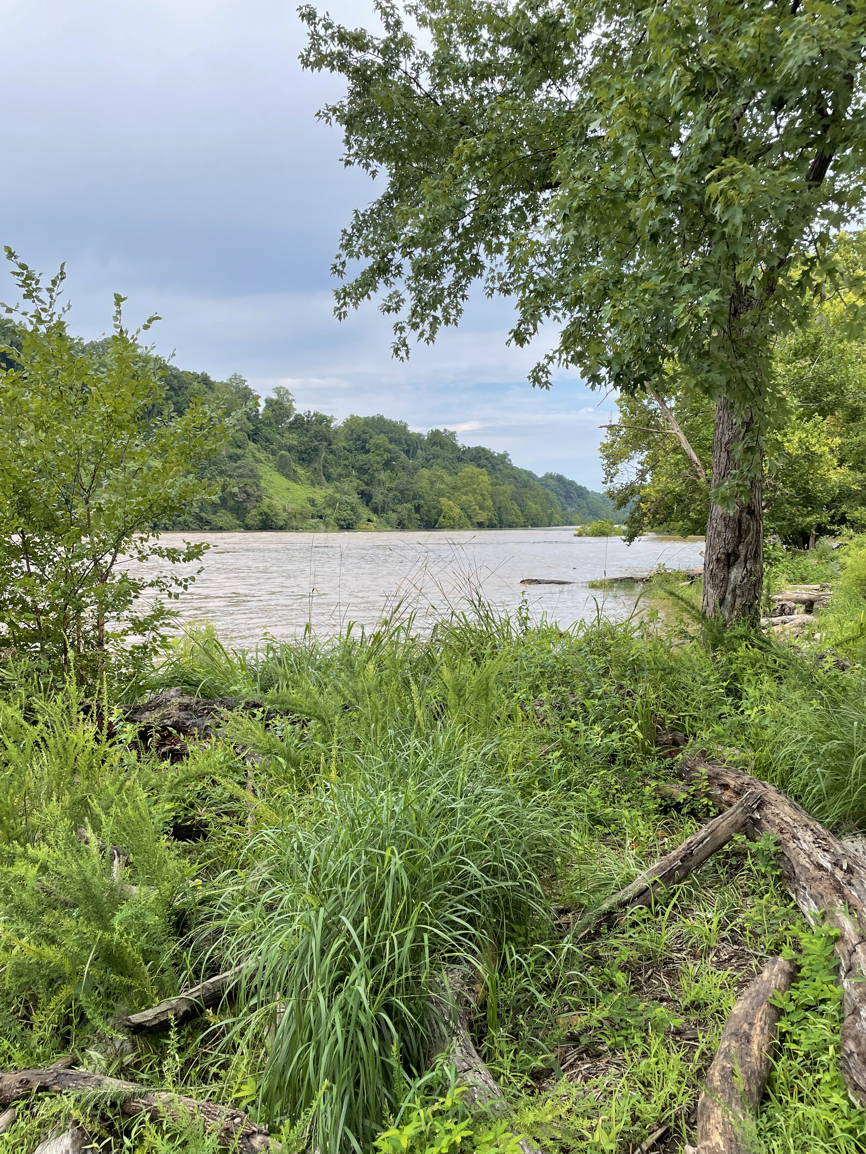 Figure 1. View looking upstream (NW) at Fletchers Cove (see Fig. 2 for location). The park occupies a floodplain opposite cliffs, seen rising to the left in the photo. The water level and flow were high after a tropical depression, but the river bottom isn’t rocky in this relatively deep pool.