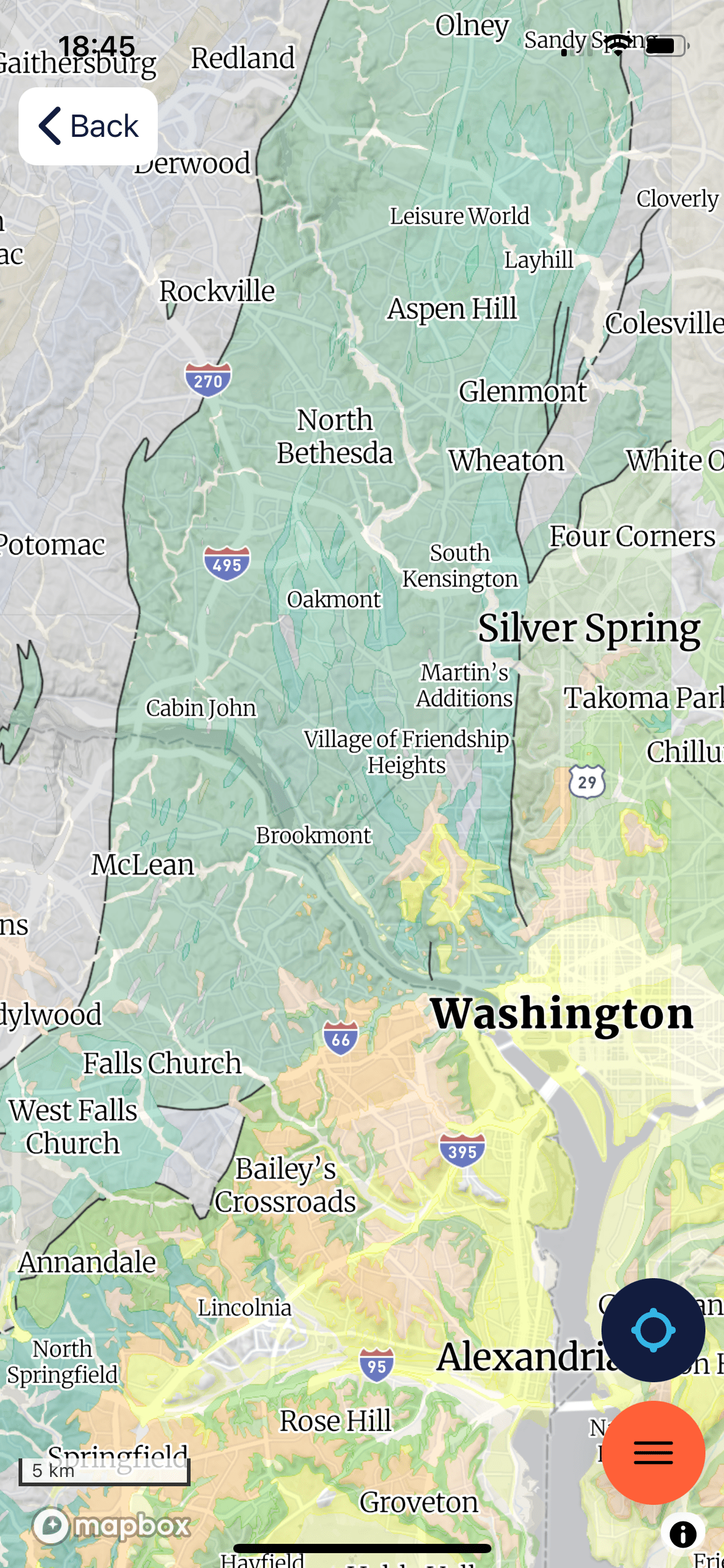Figure 4. (A) Map of a debris flow (aka alluvial fan) at Mint Springs Valley Park, stop three in Fig. 1B (map courtesy of VA Dept. of Energy), showing how it was focused on the small lake at the park. Further up the valley, large boulders became apparent, but the landscape had been massively altered during construction of homes. (B) At the park, the slide appears as a smooth (graded) surface devoid of large boulders.