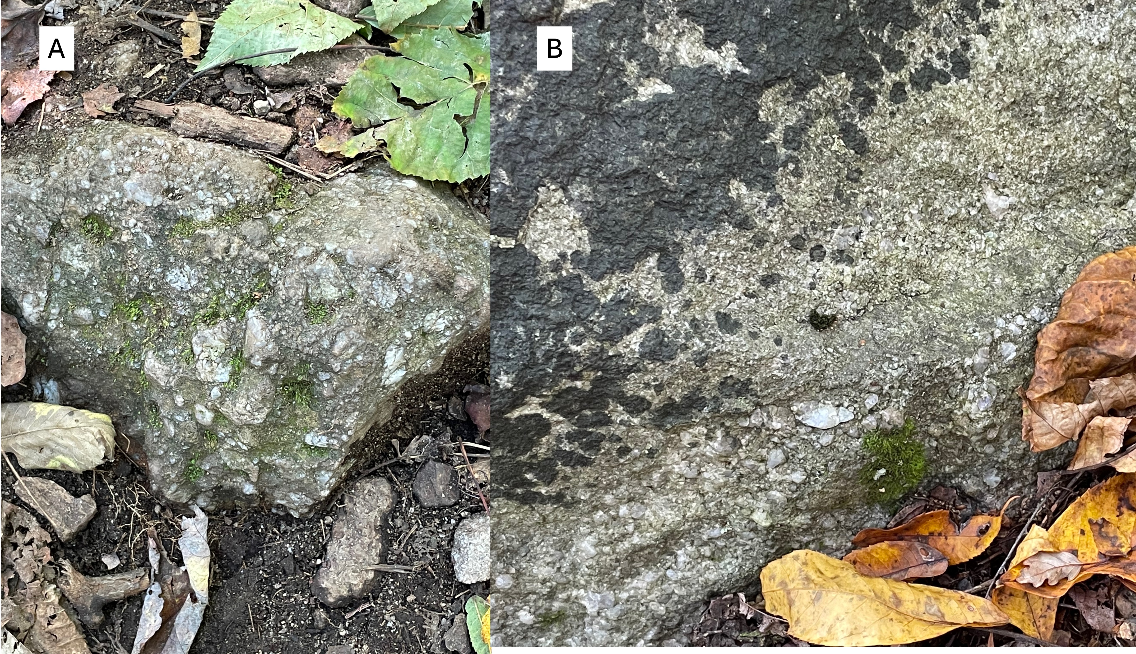 Figure 4. (A) Photo of loose boulder along the trail near Fig. 3, showing what looks like quartz filling a vein in a host rock that seems to contain some clasts, although quartz has penetrated pretty thoroughly. The dash lines are meant to suggest where the quartz is less massive; there are also several locations where a thin layer composed of fine-grained, gray material is found. Not a great example. (B) This is a better example, but the trees weren’t cooperating. The arrows point to irregular clasts contained in a gray matrix. However, the gray could be a weathering color.