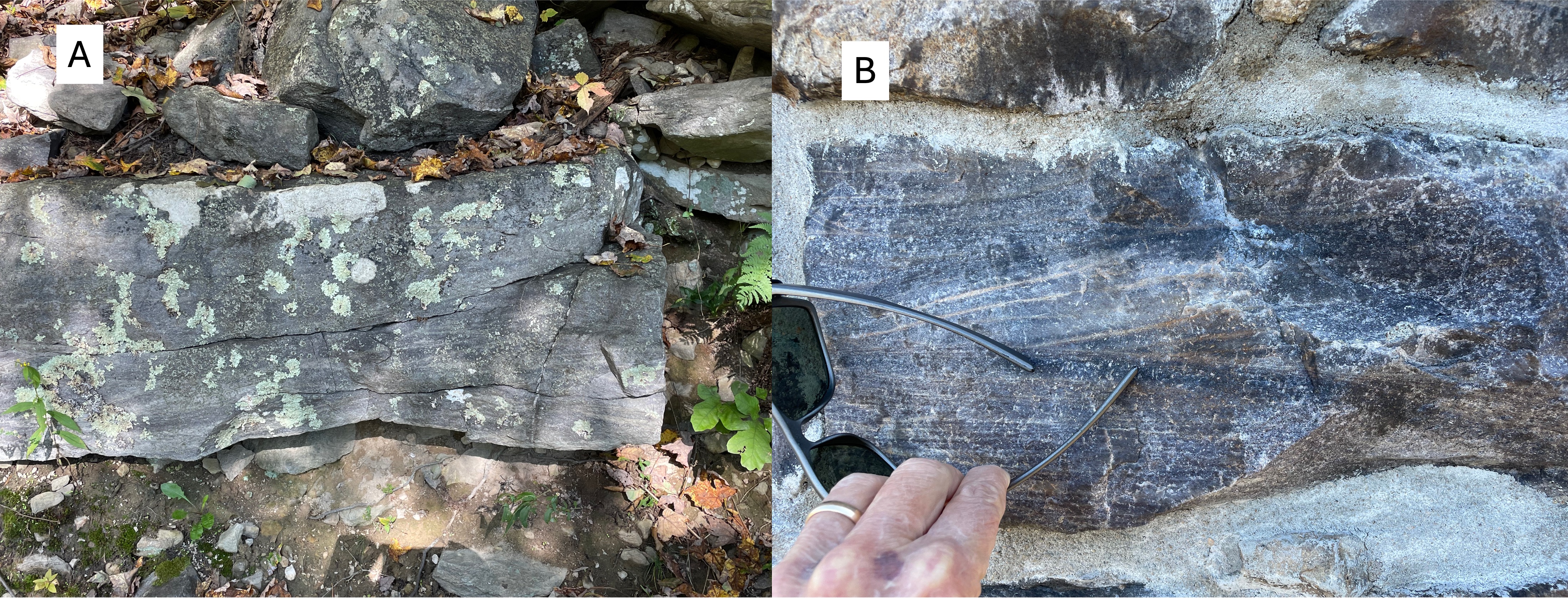 Figure 5. (A) Quartz in a vein (<1 inch thick) from near the monument. Note that the cross-bedding is very similar to Fig. 4 but more weathered. (B) Less-common view of a quartz vein seen obliquely, showing the surface that was against the country rock. These veins would have been injected during a period of magmatism, sometime between 2500 and 511 Ma; I can’t be more specific because I don’t know exactly where the radiometric ages were measured within these rocks. However, the Weverton formation is approximately 4500 feet (1.4 km) thick here; thus it’s possible that these rocks were deposited episodically during this immense time interval; but no unconformity (i.e. erosion or non deposition) is mentioned in RockD.