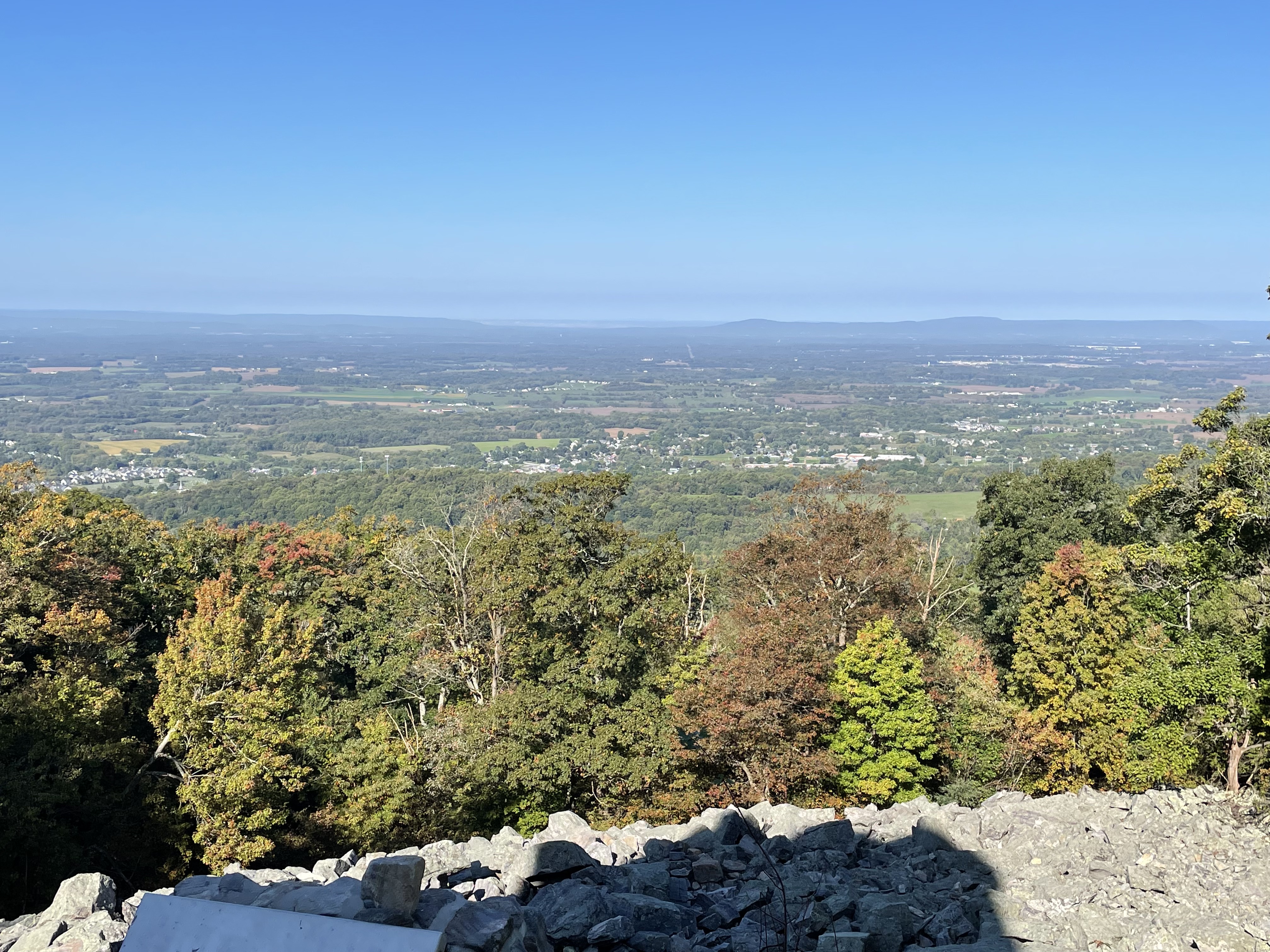 Figure 6. View looking east from the Appalachian Trail, showing the terrain typical of the Appalachian foothills. To the left of center, outcrops of Weverton rocks (Cw1 and Cw2 in Fig. 2) can be seen.