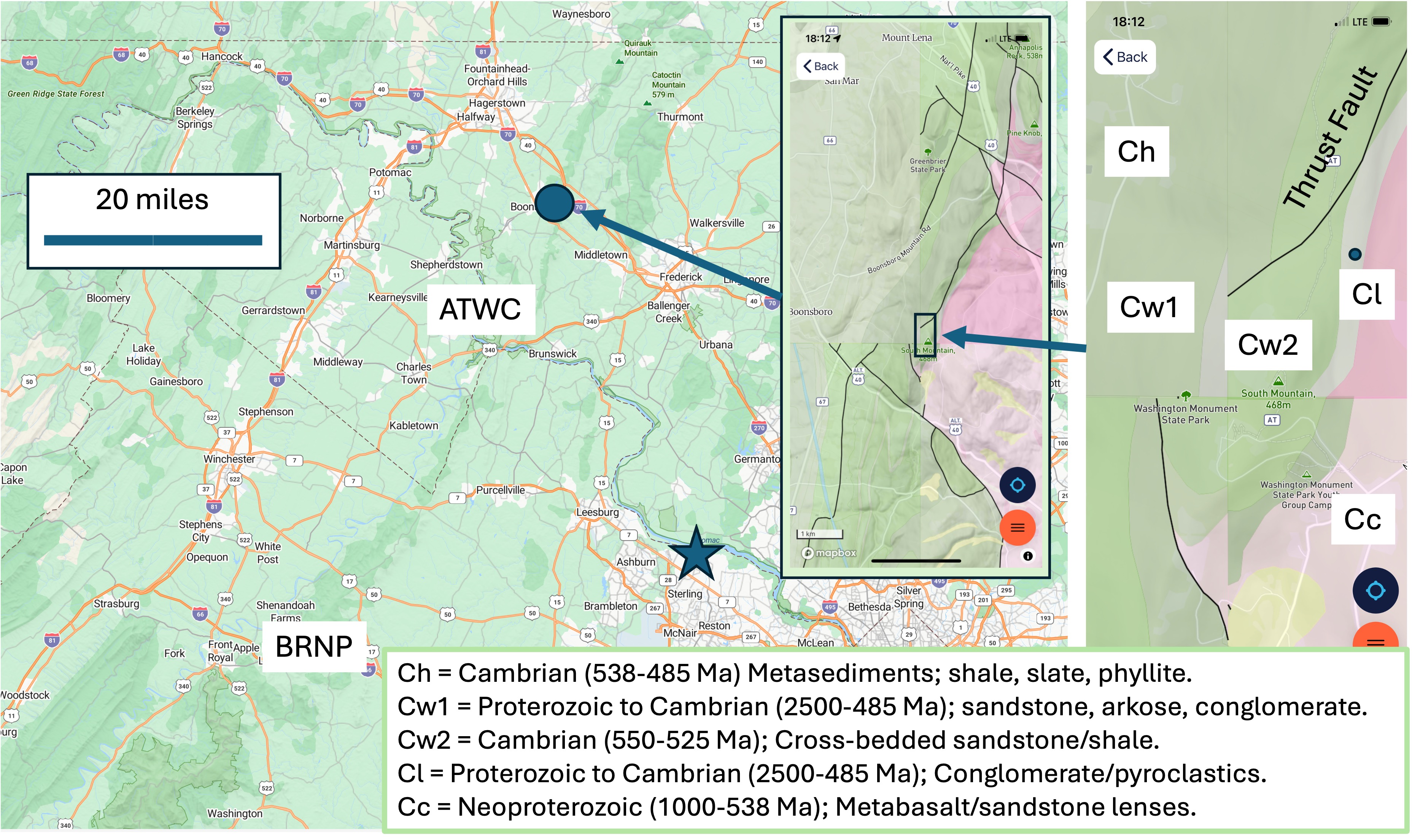 Figure 2. The field site. Washington Monument is indicated by the purple circle and arrow in the large map. The first inset map shows the geology around the monument. Note the mismatch in geology from different quadrangles; this must be a problem with either the data or Rock D, but the units (indicated in the smaller inset map to the right) were consistent when I clicked on a point. My home is indicated by the star, so you can see we haven’t traveled far. ATWC refers to the Appalachian trail at Weverton Cliff, MD, which I recommend you read to get some background. BRNP represents Bull Run Nature Preserve, which I posted last year. The geological legend for the detailed inset map is at the bottom of the figure. Note that Ma stands for a radiometric age of one-million years; this age is indicative of cooling below the threshold to set the atomic clocks within the minerals, but sedimentary rocks can’t be dated this way. Therefore, these are dates when deep burial and/tectonic deformation/magmatism ceased (i.e. when an orogenic period ended).