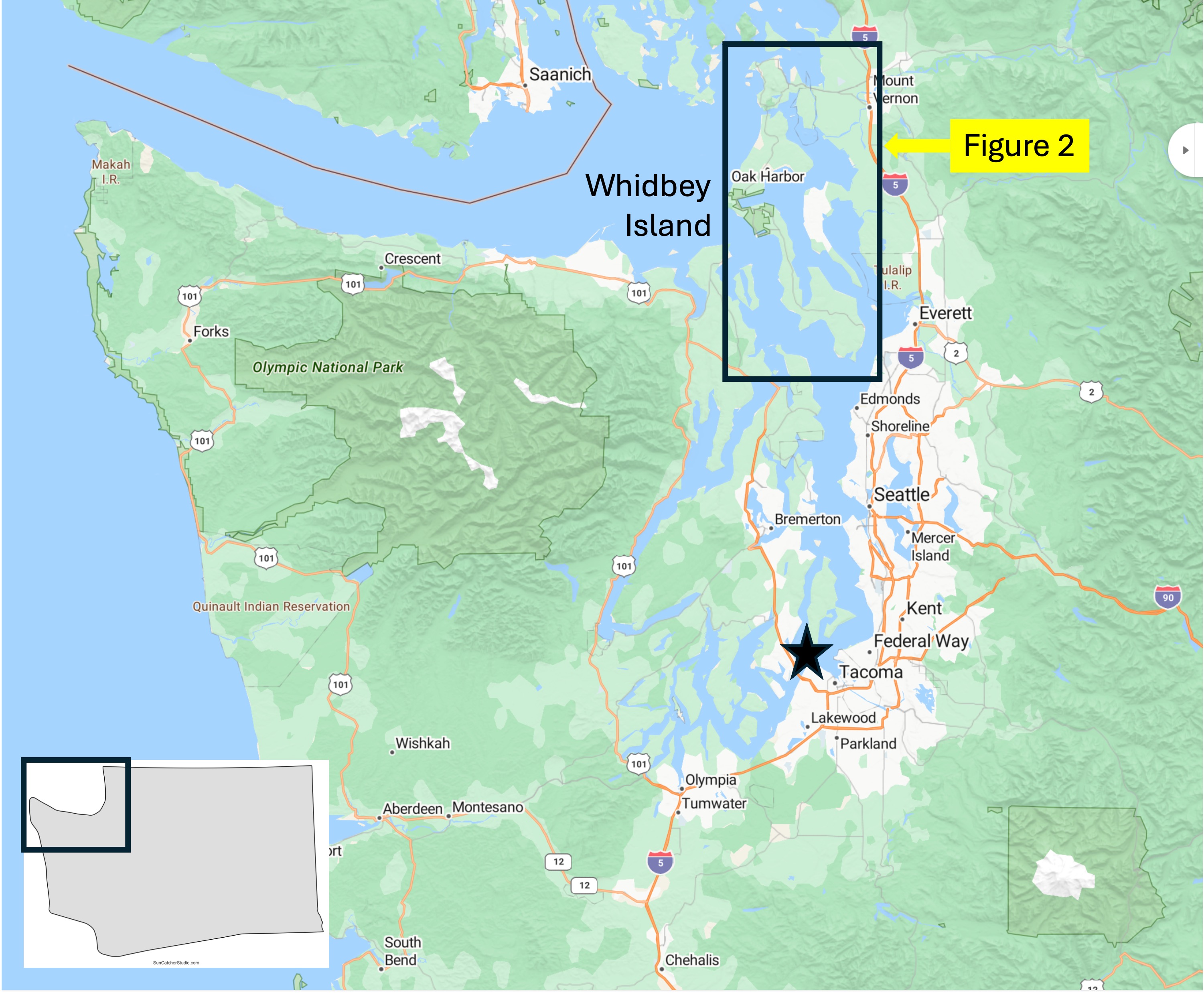 Figure 1. Whidbey Island is a large island that is almost completely covered by glacial sediments. Its elevation varies from less than 100 feet above msl (mean sea level) to almost 400 feet, probably reflecting the presence of terminal morraines deposited as glaciers retreated. The box encompasses the study area, and the star is my home in Tacoma.