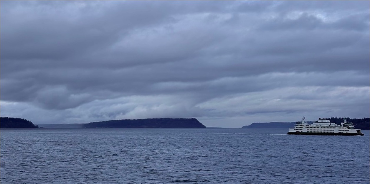 Figure 3. The ferry ride from Mulkiteo to Whidbey Island (see Fig. 2A) shows the same high elevation of Whidbey Island (left), Hat Island (center), and a promontory north of Tulalip (behind the ferry; see Fig. 1). This elevation of glacial sediments is approximately the same as the basement rock discussed below. This high relief shoreline is found throughout Puget Sound.