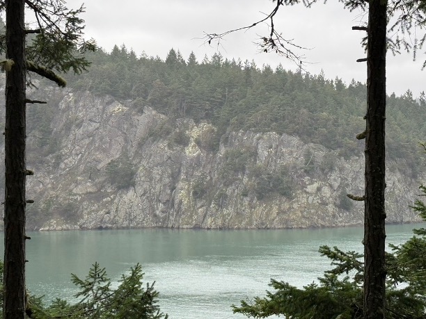 Figure 4. View looking north across Deception Pass, showing the nearly vertical bedding of rock layers, which could be original sedimentary fabric, metamorphic surfaces, or joints. Let’s have a closer look.