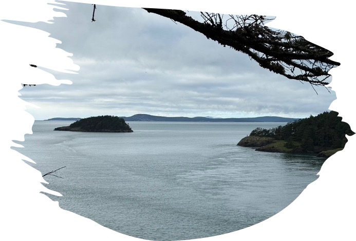 Figure 7. This photo was taken looking west from Deception Pass (see Fig. 1), towards the Pacific Ocean. Those islands are emergent blocks of jumbled Mesozoic/Tertiary sedimentary and volcanic rocks. The last ten-thousand years of sea level rise has covered most of the evidence contained within the accretionary prism, leaving us with only fragments.