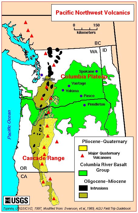 Plate 3. Map of Tertiary volcanic rocks in Washington. The oldest eruptions occurred along the Cascade range between about 50 and 2.4 Ma; the Cascades comprises overlapping volcanoes. The intrusive (black areas) and extrusive rocks from these older eruptions (brown) are weathered, the volcanoes dormant/extinct, their source plutons (buried magma chambers) exposed by erosion. The Columbia River basalts (green) flowed from fissures in the crust rather than volcanoes between 17 and 14 Ma, with ongoing weaker eruptions until about 6 Ma. These are too young for their source magma chamber to be exposed. The youngest volcanics (Yellow) are associated with active volcanoes like Mt St Helens, Mt Rainier, and Mt Hood (in Oregon). For example, Mt Rainier is about 850 thousand years old.