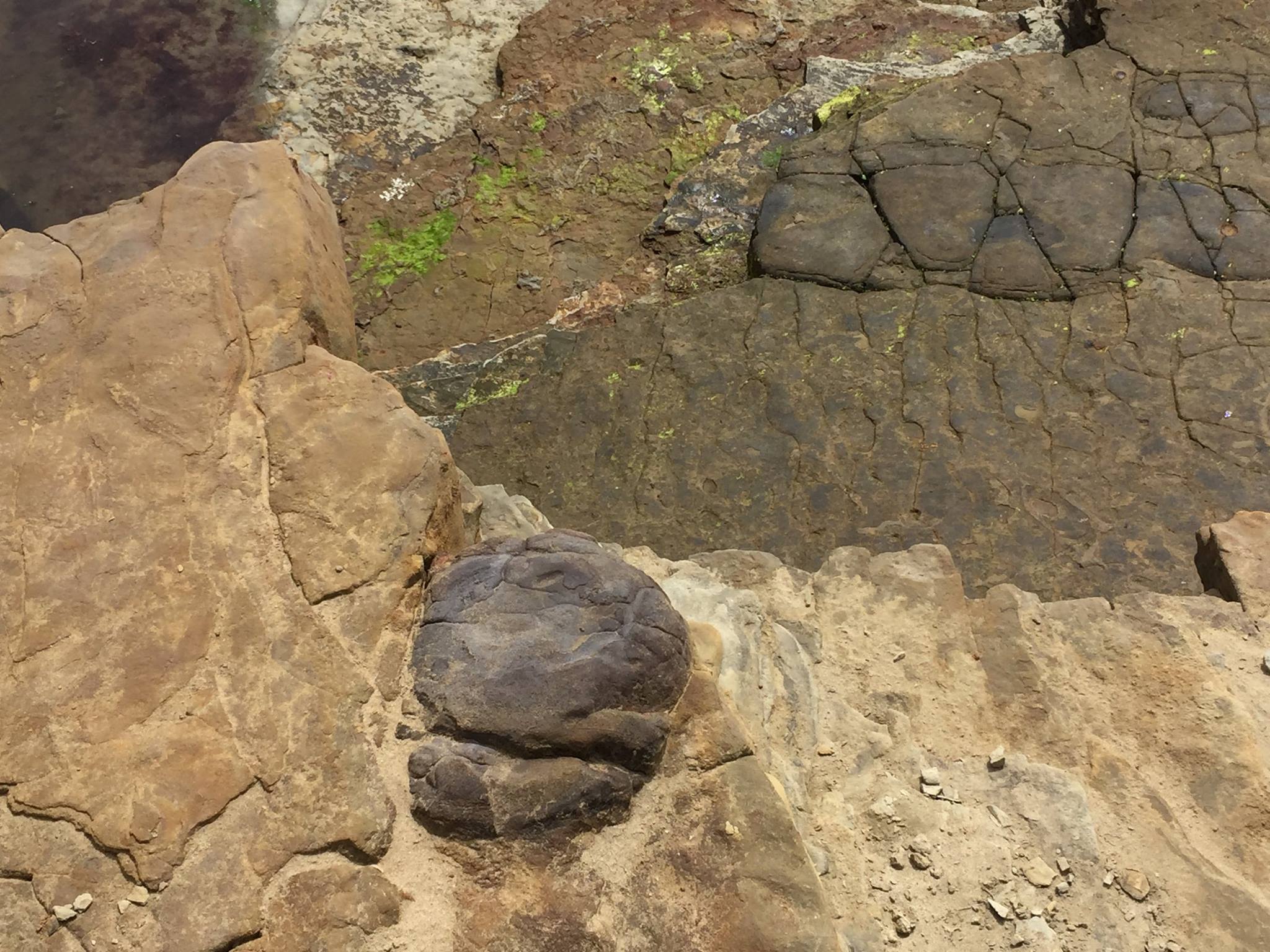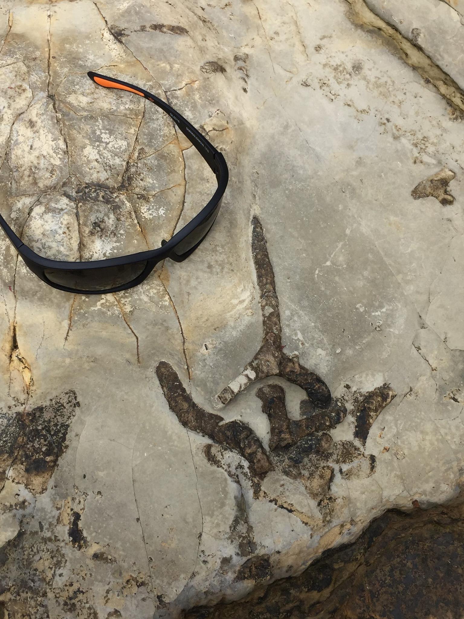 Figure 10. This exposed outcrop within the tidal zone reveals what are probably concretions of iron oxides, formed during early diagenesis. They superficially resemble fossils, but that is not the case. As the sediment was squeezed during burial, incompatible elements like iron formed irregular blobs in an otherwise uniform quartz sand matrix.