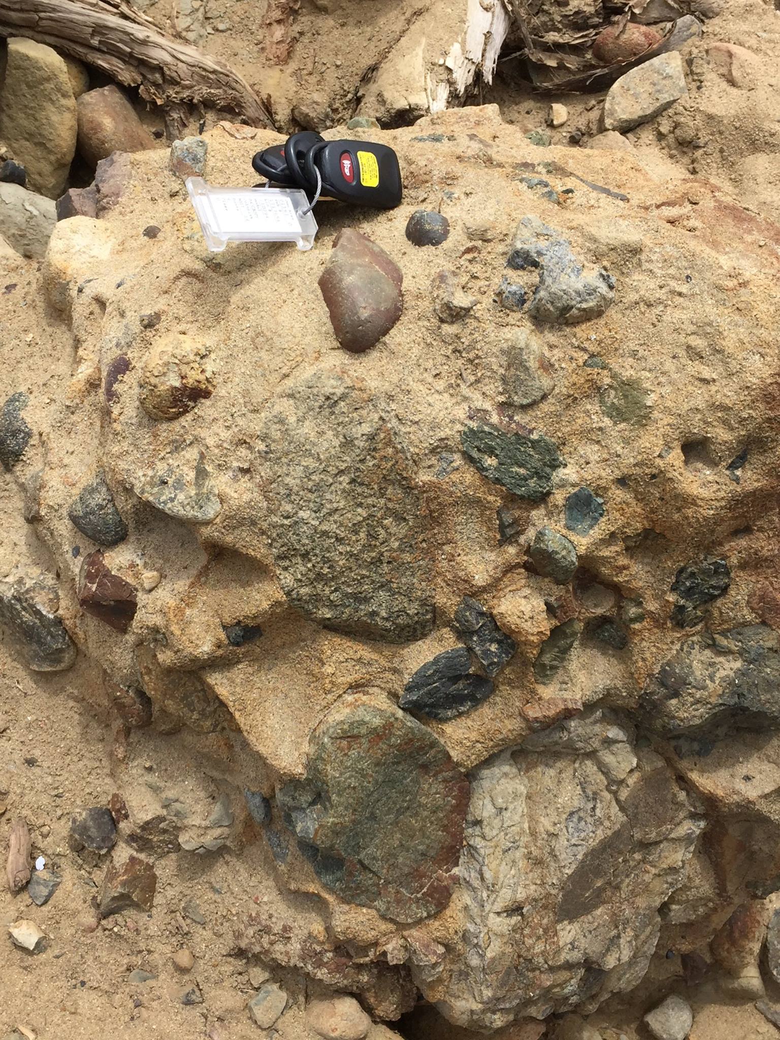 Figure 5. Photo of well-cemented conglomerate boulder lying loose near sea level. I don’t think this is Pleistocene because it is very well cemented (literally hard as a rock) rather than being friable, which is more common with younger rocks. Thus it is probably Cabrillo Formation. There were no worms burrowing on this beach! The clasts are not all rounded, but many are highly angular; thus, it might be classified as a breccia. This is a significant difference because conglomerates are deposited some distance from their source, after the rocks have been broken and rounded to a relatively uniform size. Breccias, however, collect near steep slopes and the rocks are irregular in shape and size; these rocks indicate a nearby highland. The clasts include, by my estimation: basalt; granitic intrusive rocks; metamorphic rocks; and of course a plethora of sand-sized quartz as the matrix.