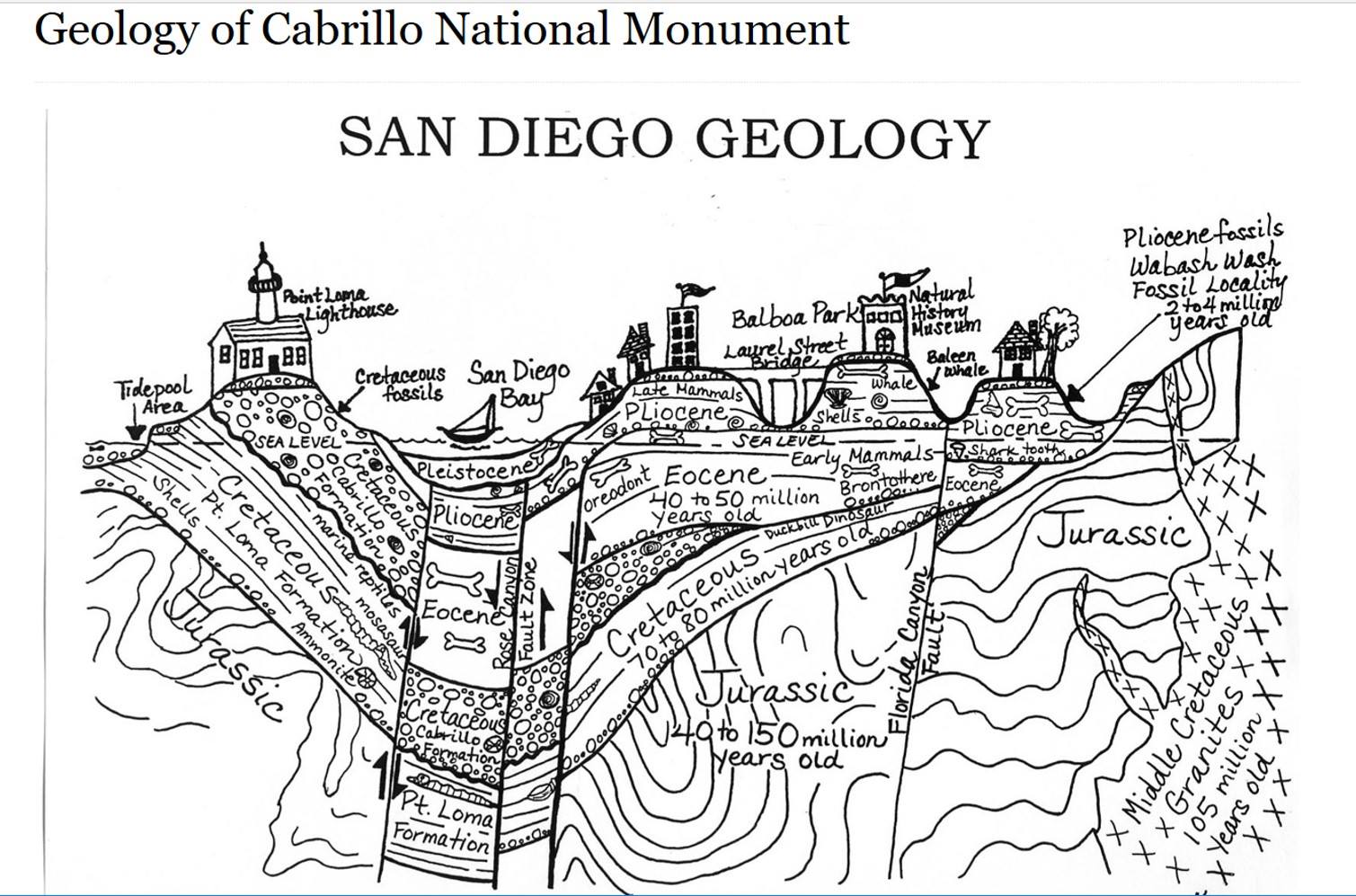 Figure 2. This idealized cross-section across Point Loma reveals complex, subsurface geology, including folds in the Jurassic rocks, which are unconformably overlain by the Cretaceous Pt. Loma and Cabrillo formations. Normal faults, indicated by arrows, have lowered younger rocks in a graben to form San Diego Bay, leaving Point Loma peninsula standing alone. Note that Pleistocene sediments are located along the seaward margin of the peninsula as well as at the tops of the ridges. This occurs because younger material was deposited on wave-cut benches that developed as sea level fluctuated, in addition to regional uplift rate of 4-8 inches/thousand years (0.1-0.2 mm/year).