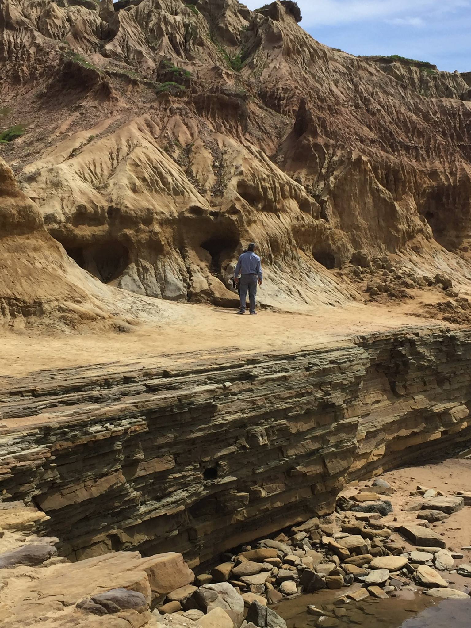 Figure 6. The man is standing on a wave-cut terrace about 20 feet above the high tide line. The angular unconformity is present at this location because Pleistocene sediment was deposited on this erosional surface, even though the older rocks are present at a higher elevation, as indicated in Fig. 2.