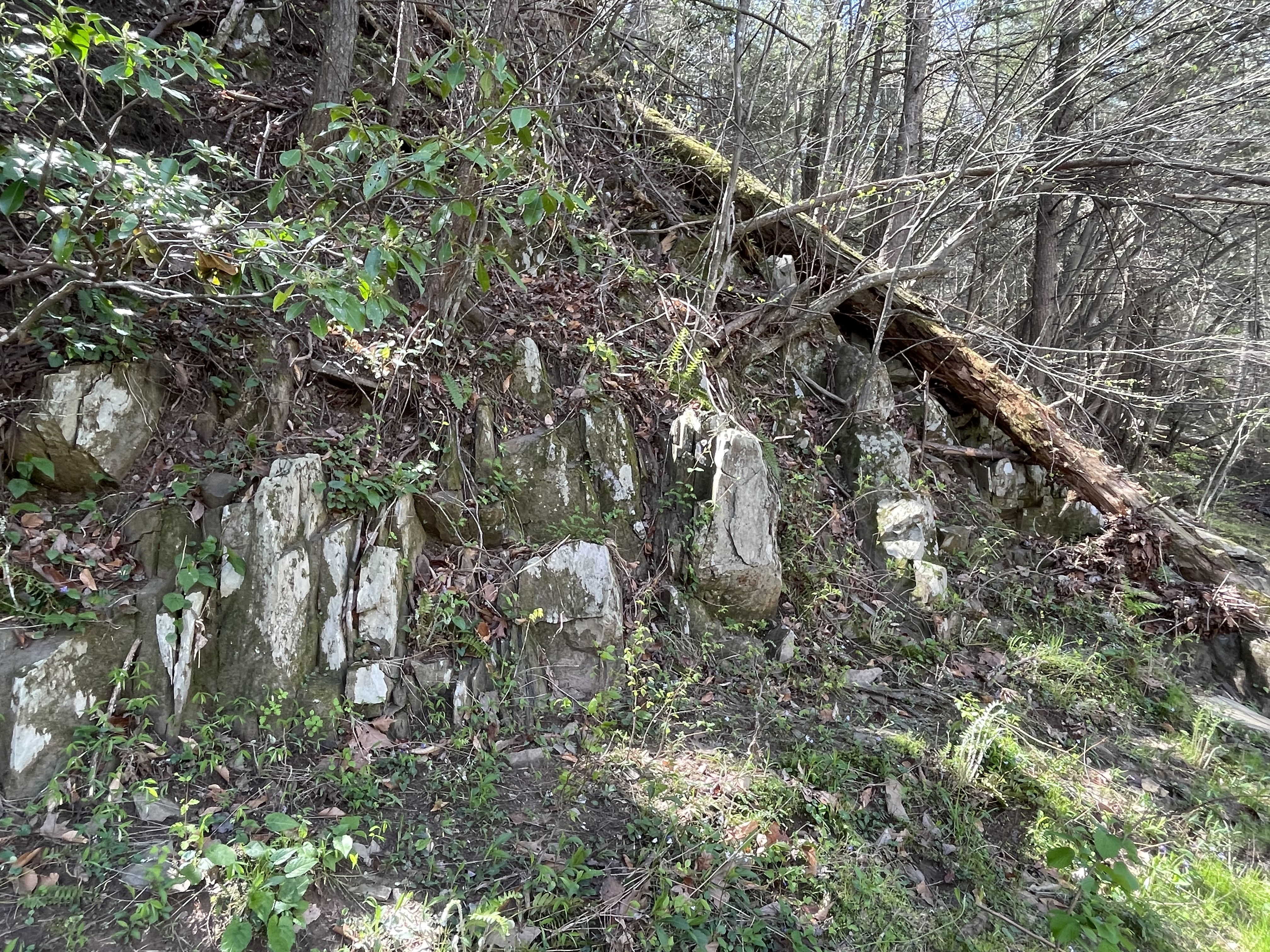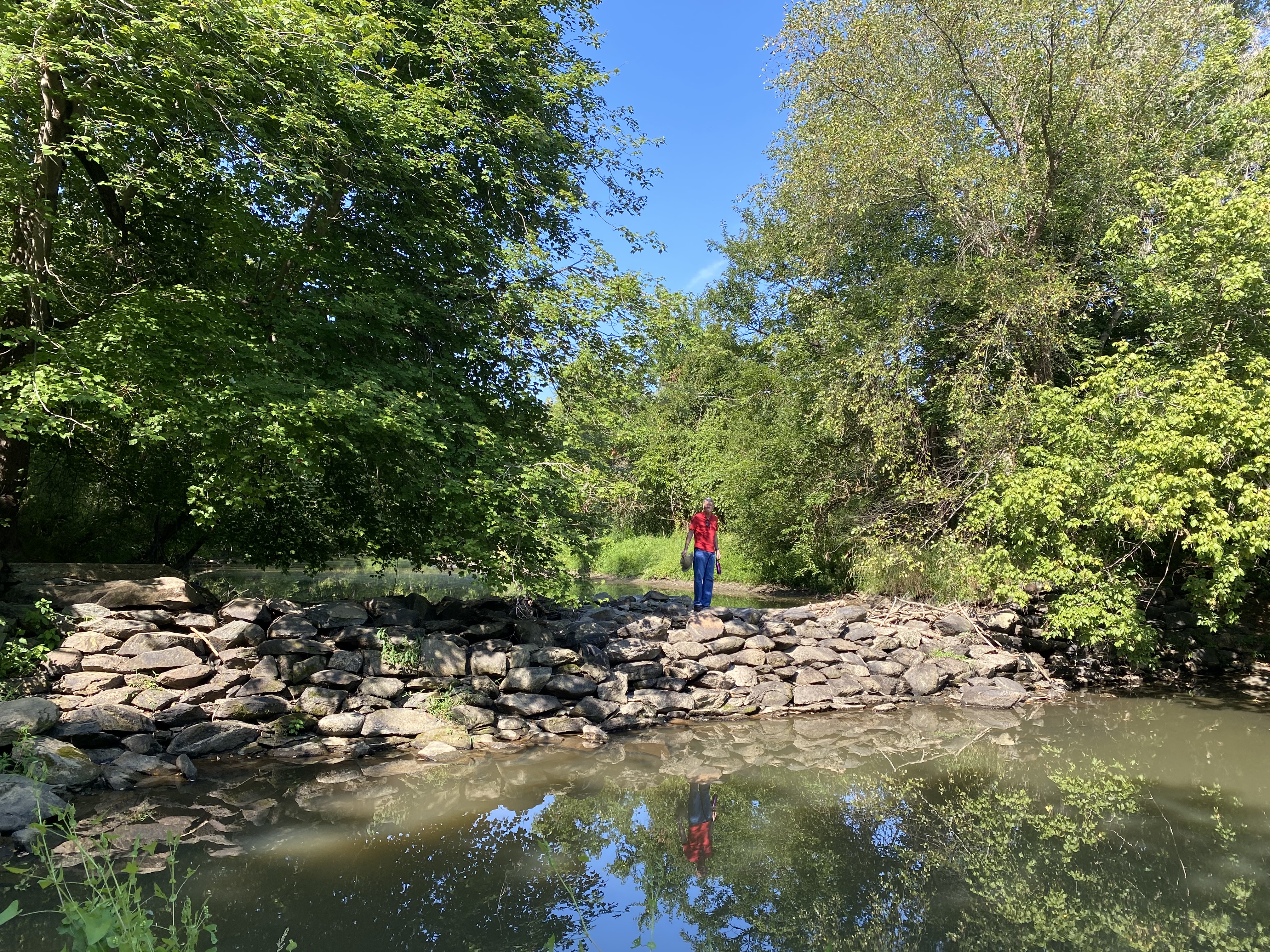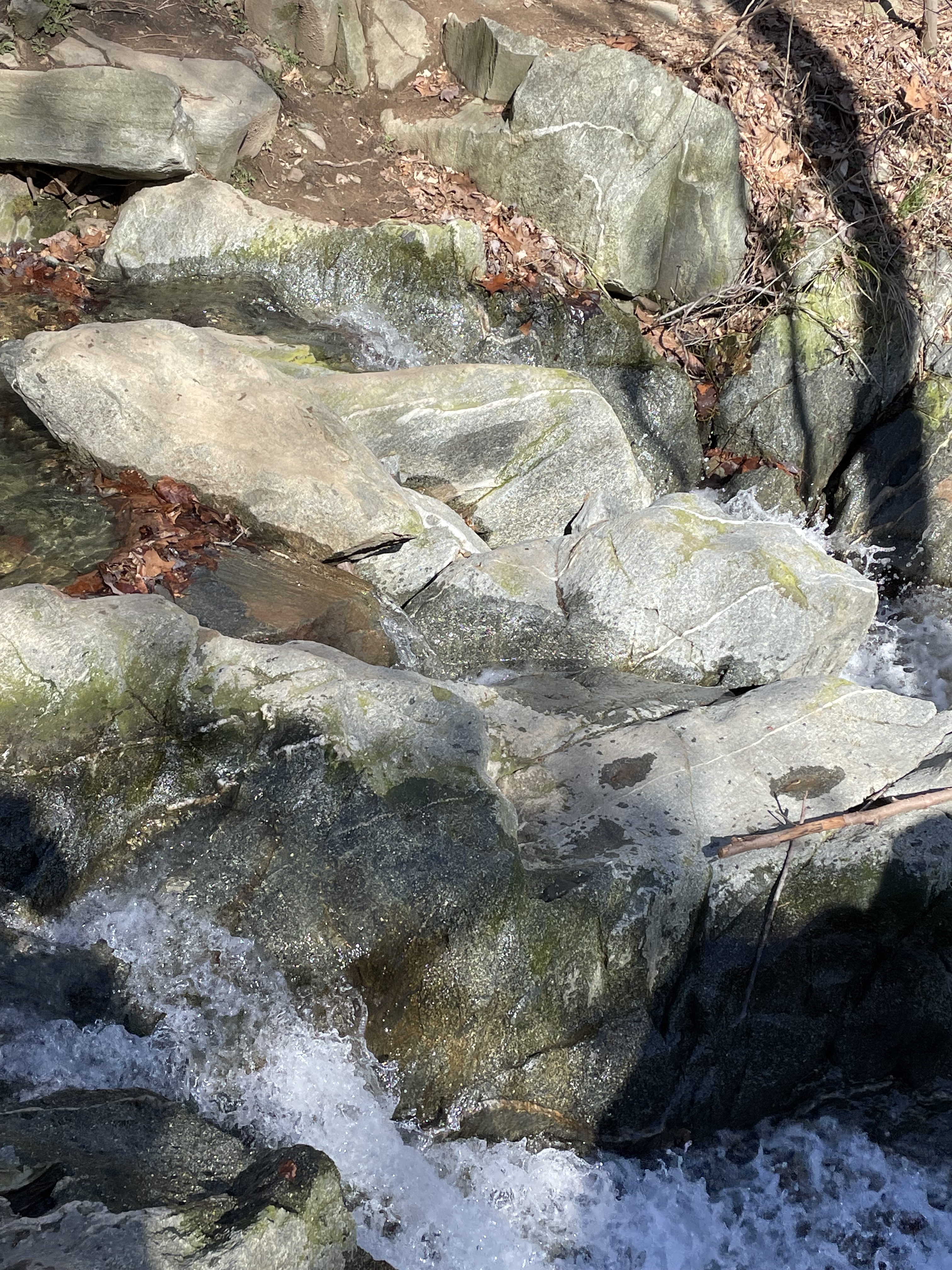 Figure 5. The dam constructed to retain water for Waterford mill contains a variety of large boulders, but the majority were schist (see Fig. 4C). I didn’t see any granite or gneiss, which isn’t surprising because these large stones would have been difficult to transport in the early nineteenth century. They used what was readily available; the exposure of schist along the creek bed (Fig. 3A) suggests that the ridge fronting the mill (Fig. 1) was a likely source of material; after all, rock had to be removed to build the mill and the town of Waterford.