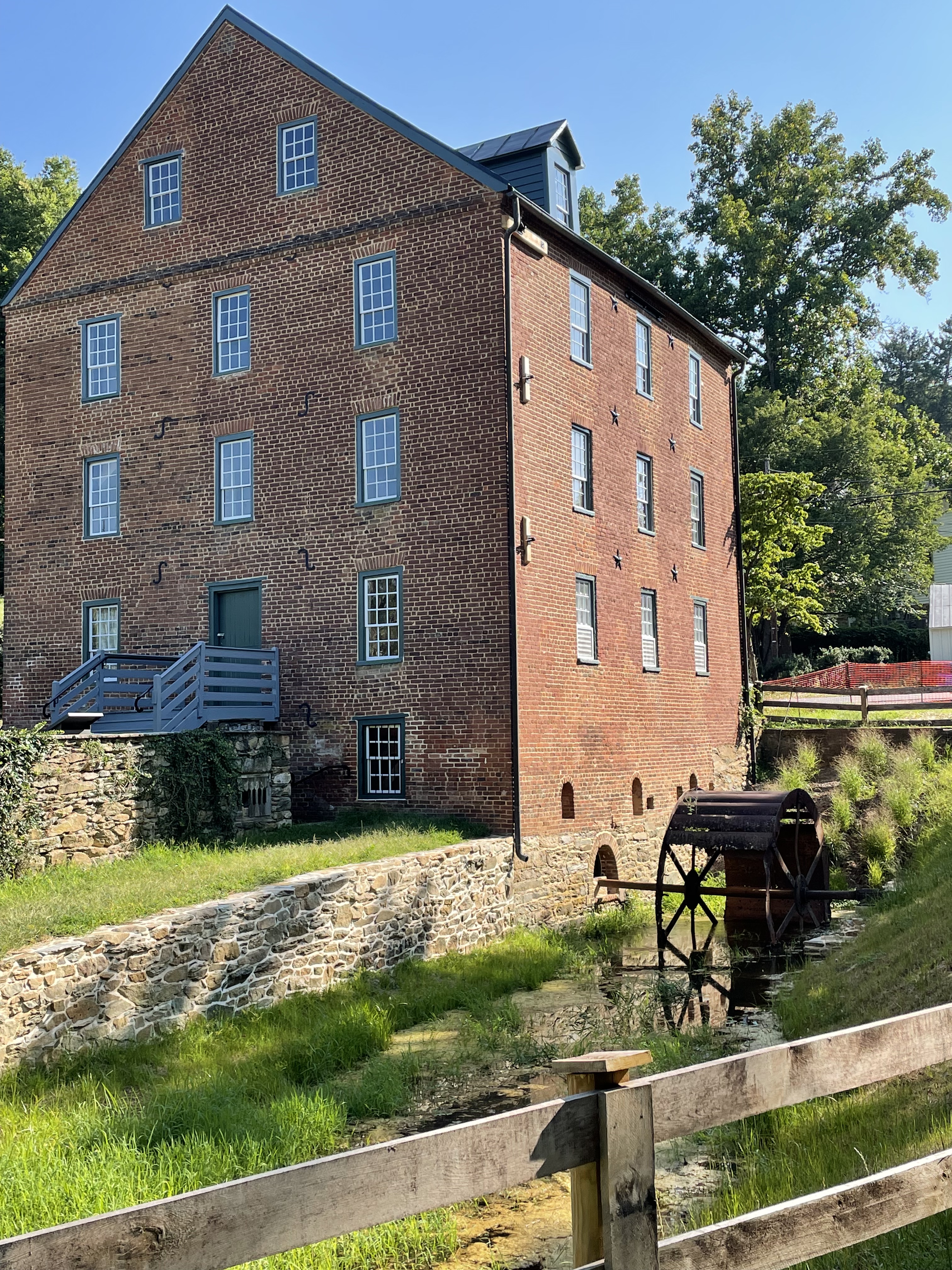 Figure 1. The Waterford mill was constructed in the 1820’s and operated until 1939. It was located along Catoctin Creek because there is a significant drop in stream elevation here. A low ridge behind the mill suggests part of the reason: resistant rocks that produce a series of sudden drops in the stream, perfect for collecting water behind a dam not too far from the mill. The shorter the length of the “head race”, the lower the construction costs. The “tail race” can be seen leading from the waterwheel. This small ditch leads around the facility and drains into Catoctin Creek a couple hundred yards downstream. This post will explore upstream on Catoctin Creek, as far as the mill pond (storage pond for hydraulic pressure), and see what the rocks tell us.