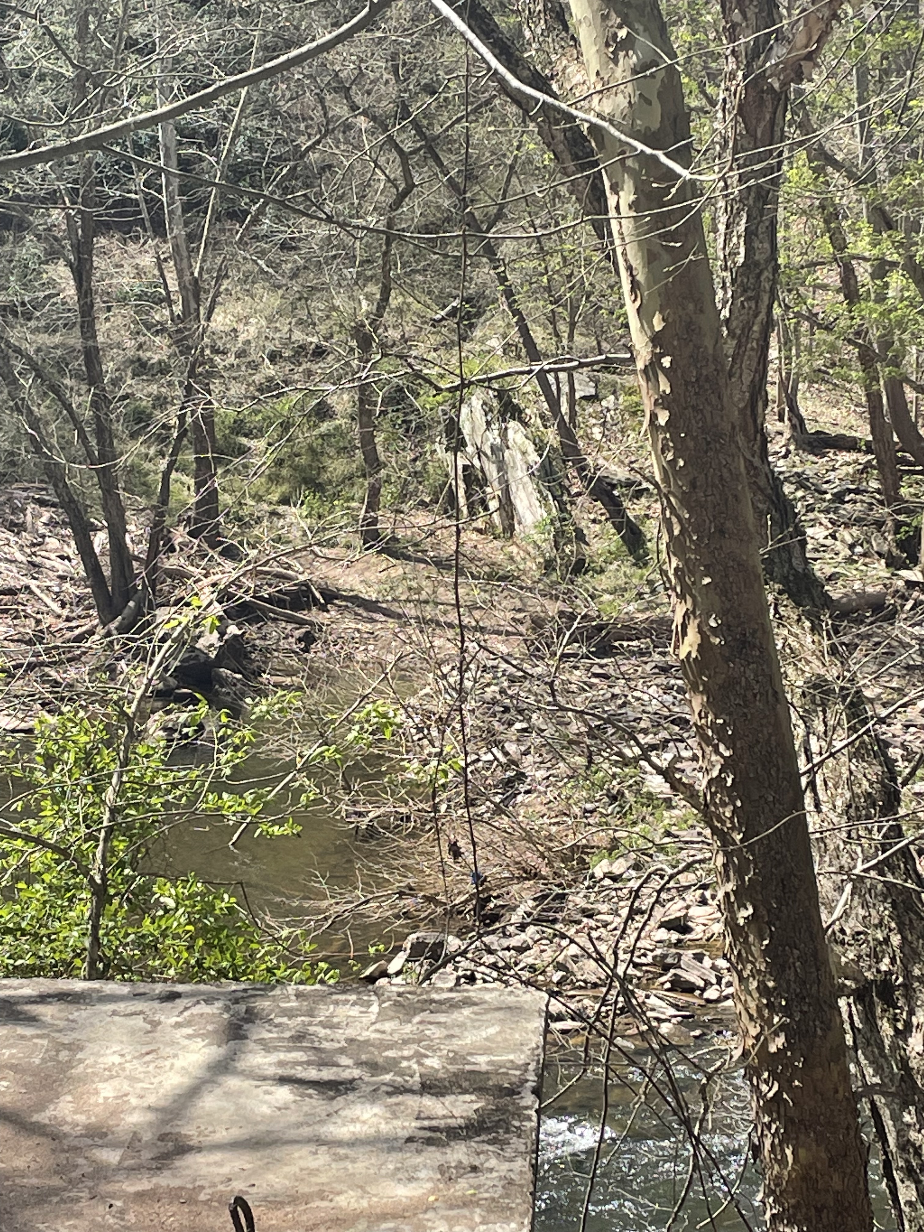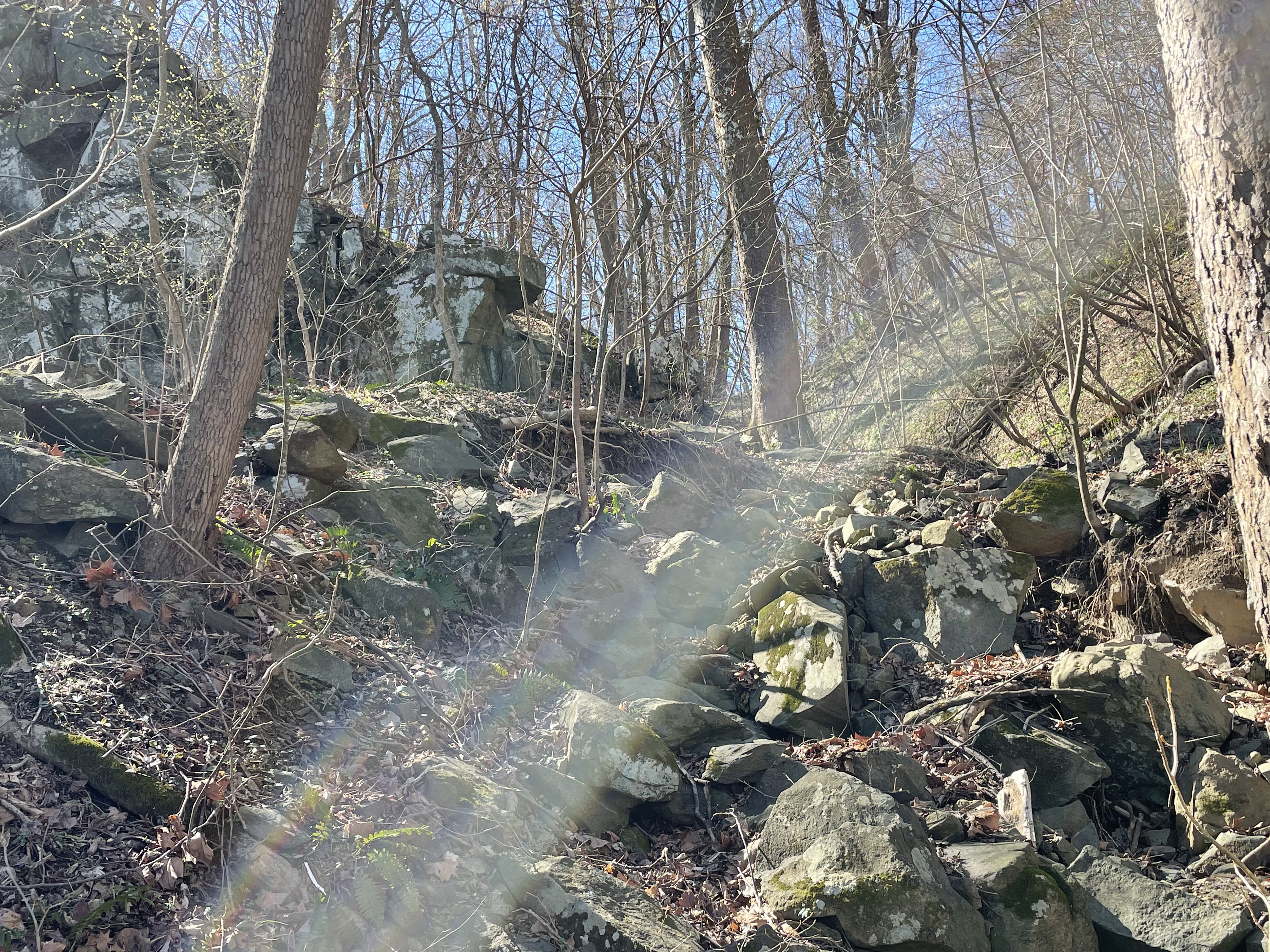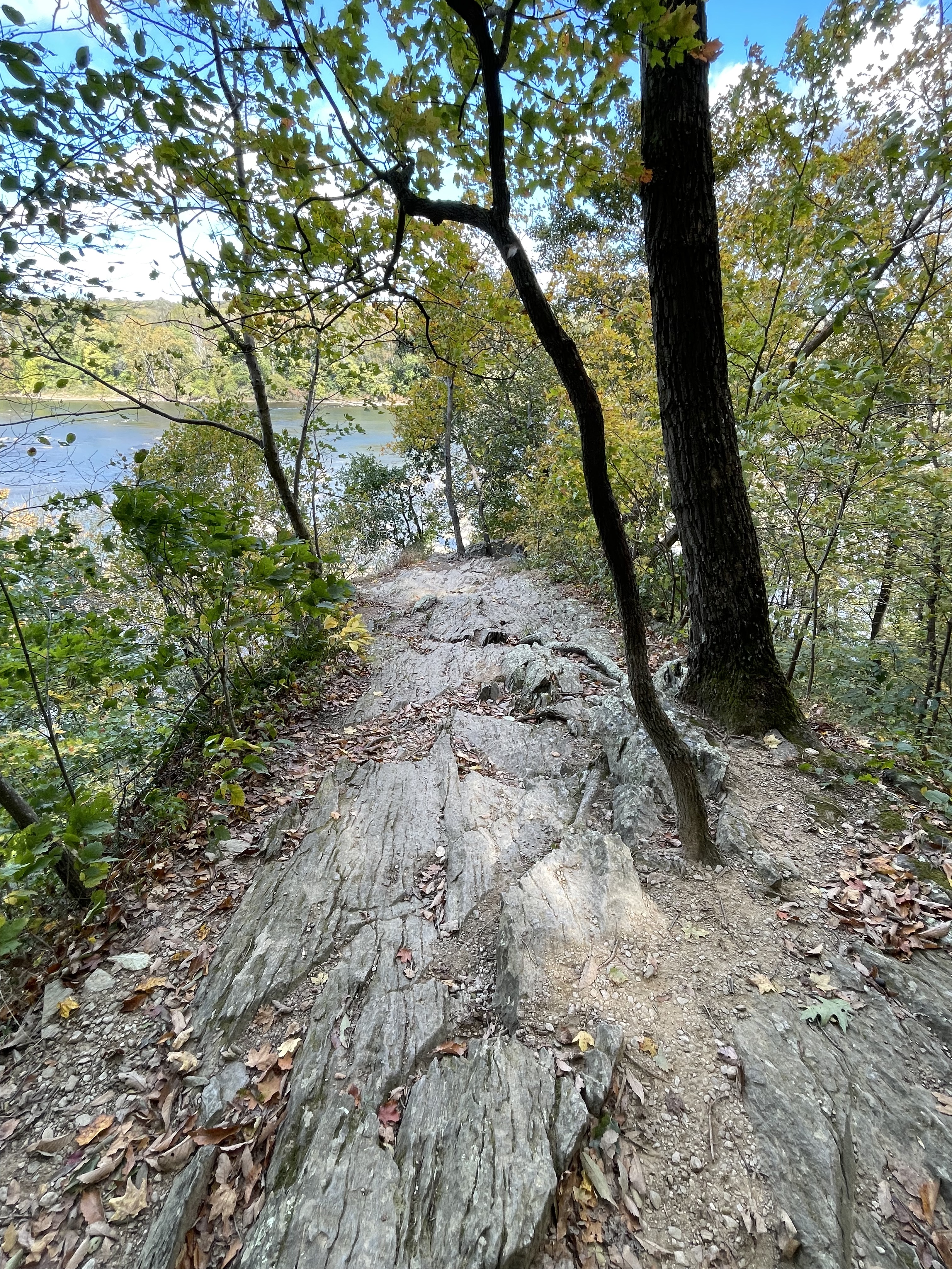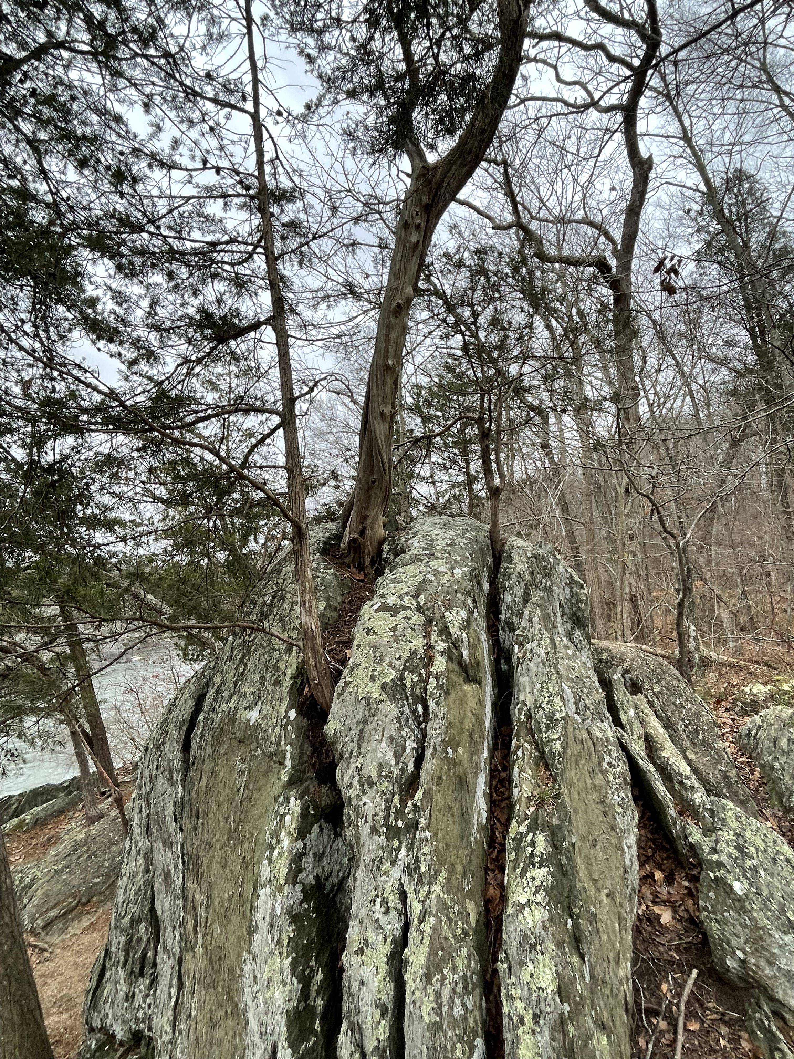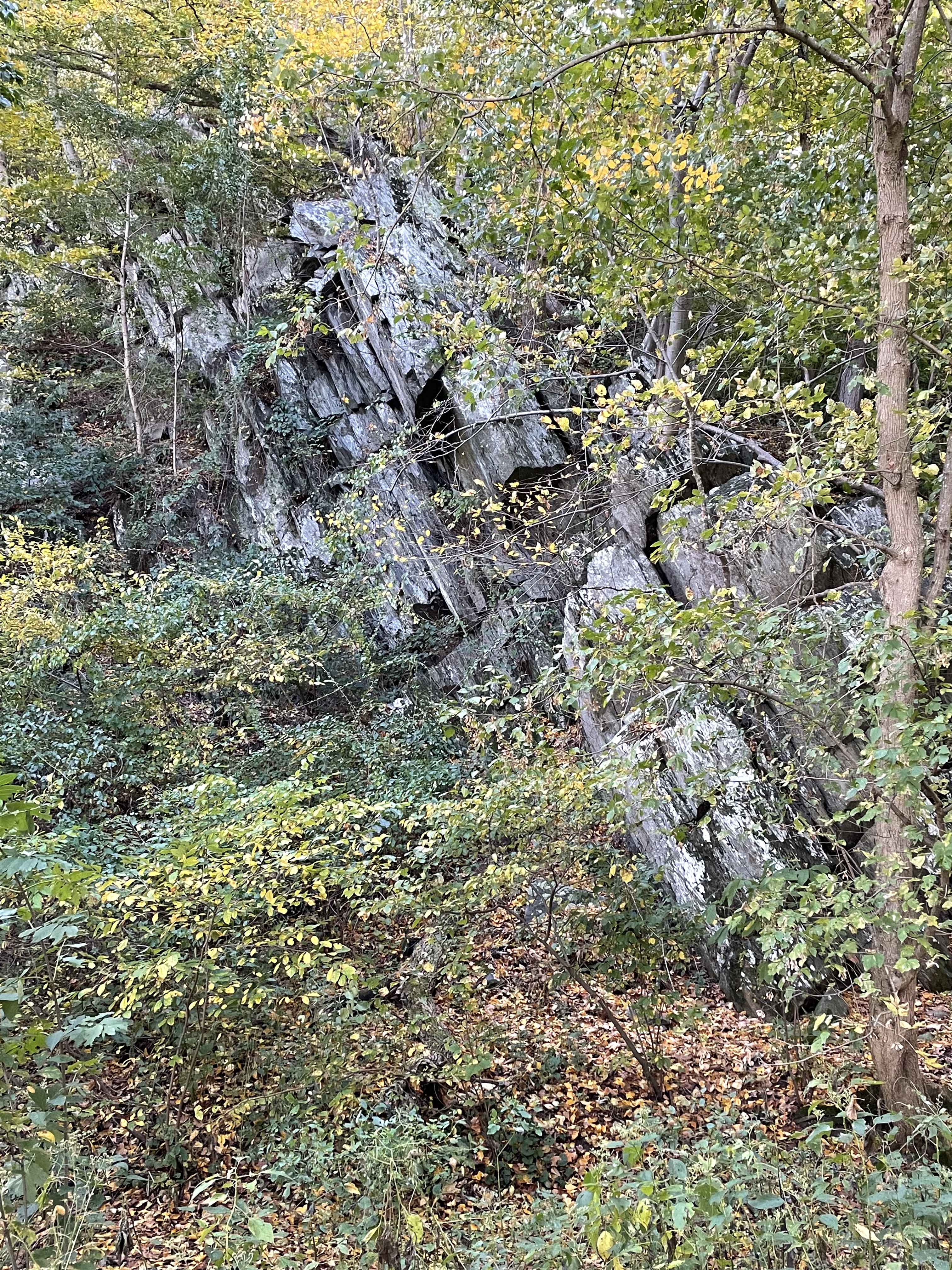 Figure 4. Photo from the top of the cliff seen in Fig. 3, showing the foliation I was talking about. This ridge (see Fig. 2 for location) is demarcated by short streams with steep slopes on both sides. Here, about 60 feet above the Potomac, it narrows to less than 10 feet along its spine.