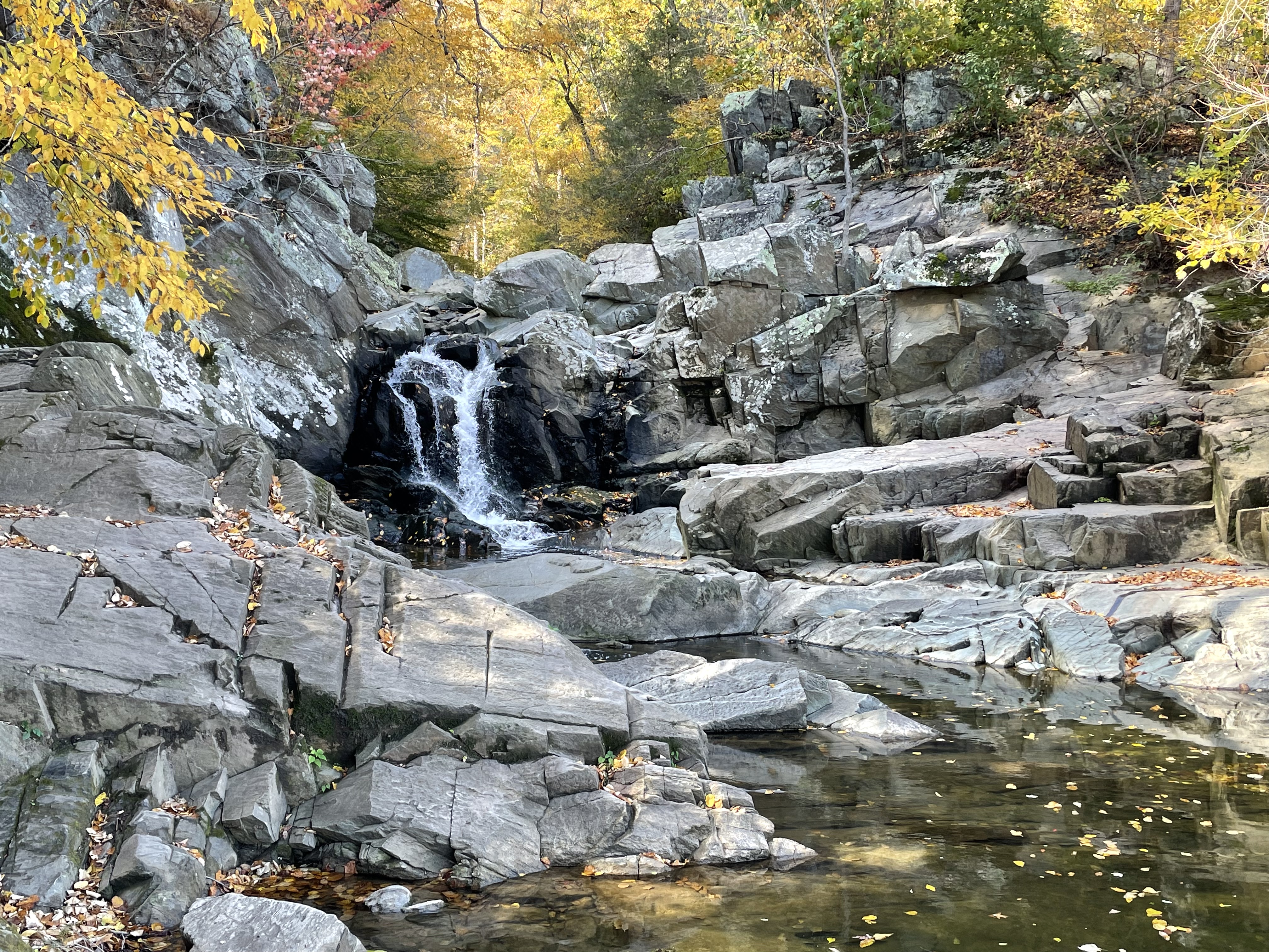 Figure 1. This post explored some of the Precambrian (1000 – 511 Ma) metamorphic rocks we’ve seen before along the Potomac River in Northern Virginia (NOVA). We followed Scott’s run to the waterfall (see Fig. 2 for location), where the creek dropped about ten feet at the current level of the Potomac. This photo shows a massive metasedimentary rock with no foliation. According to RockD this is a metagraywacke, which is a poorly sorted sand-silt sediment deposited on submarine fans (e.g. at the mouth of rivers), with distinctive structures that indicate slumping. The dates are indicative of the age of metamorphism rather than deposition. This is a thick formation but I couldn’t find a measured thickness but, based on its exposure along the Potomac, it must be thousands of feet thick; the large range in ages supports a model of continuous deposition/burial/low-grade metamorphism for hundreds of millions of years. Like a conveyor belt. There is no evidence of magmatism in this area, although a thick sequence of greenstone (metamorphosed basalt and associate volcaniclastic sediments) of this age is exposed in Shenandoah National Park.