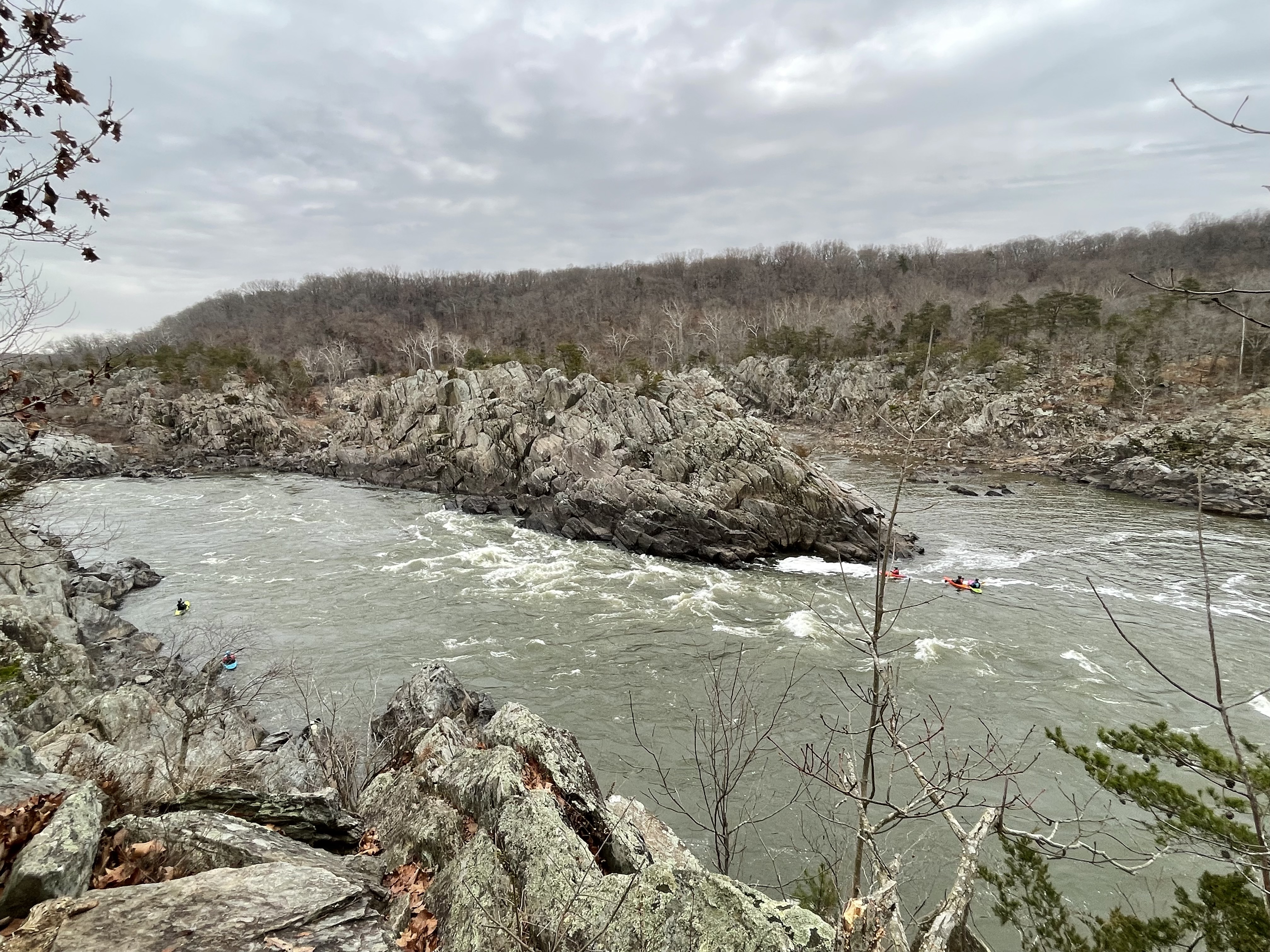 Figure 4. View looking downstream from the same location as in Fig. 3. The Potomac River can be seen in the upper center of the photo as a gray triangle pointing downward. Note the large blocks of metagraywacke clogging the channel and the steep face on the other side of the river. A nearby ravine like this was used to construct a series of locks to raise barges about 80 feet to enter an 18th century canal system (see Fig. 2 for location).