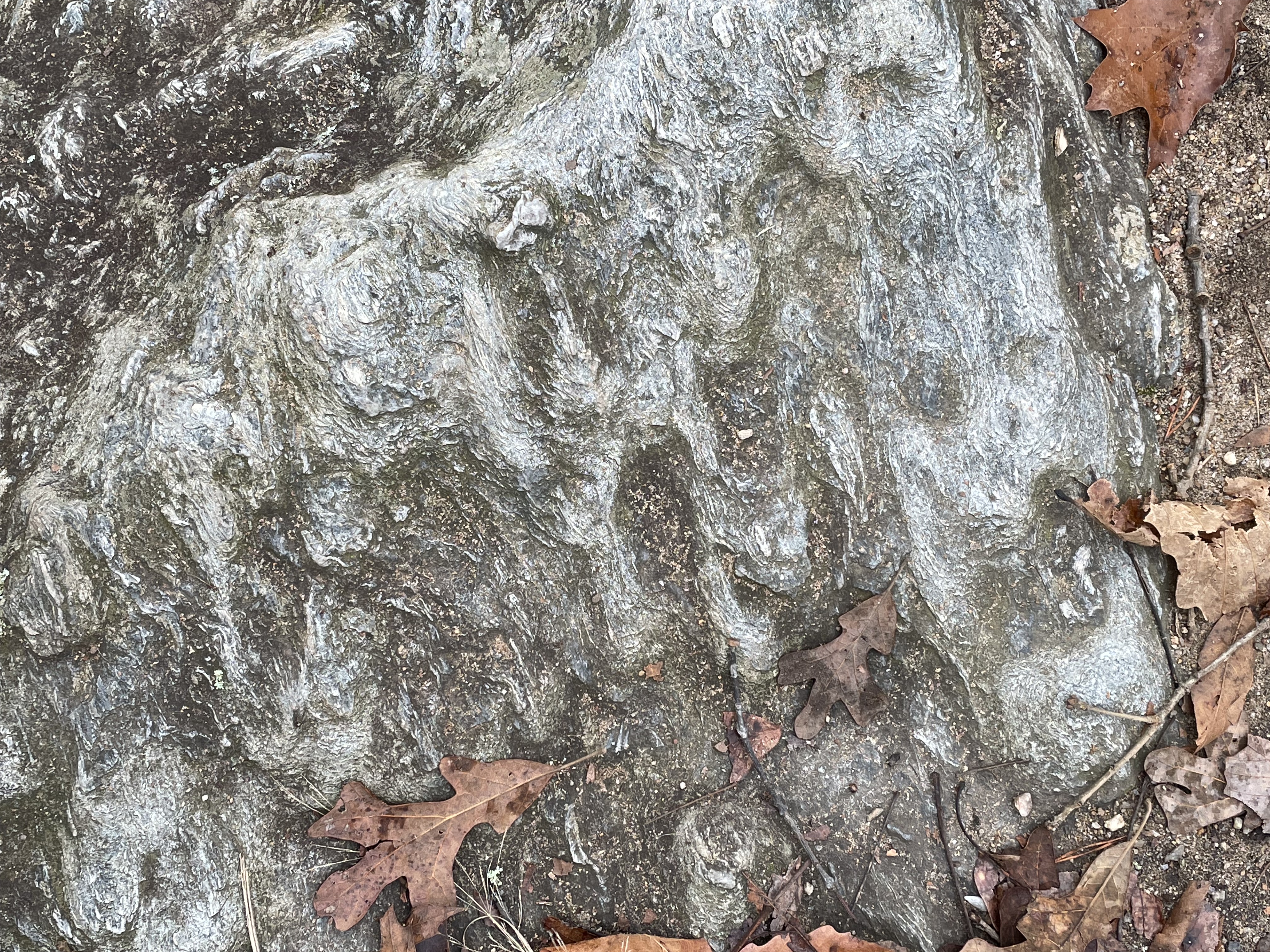 Figure 10. Original bedding plane of the metasedimentary rocks. The lumpy surface is very similar to muddy sediments in modern submarine fan and trench settings, where sediment slides down steep slopes. Any fossils (if there ever were any) were destroyed during metamorphosis, which contributes to the dating problem I alluded to above.